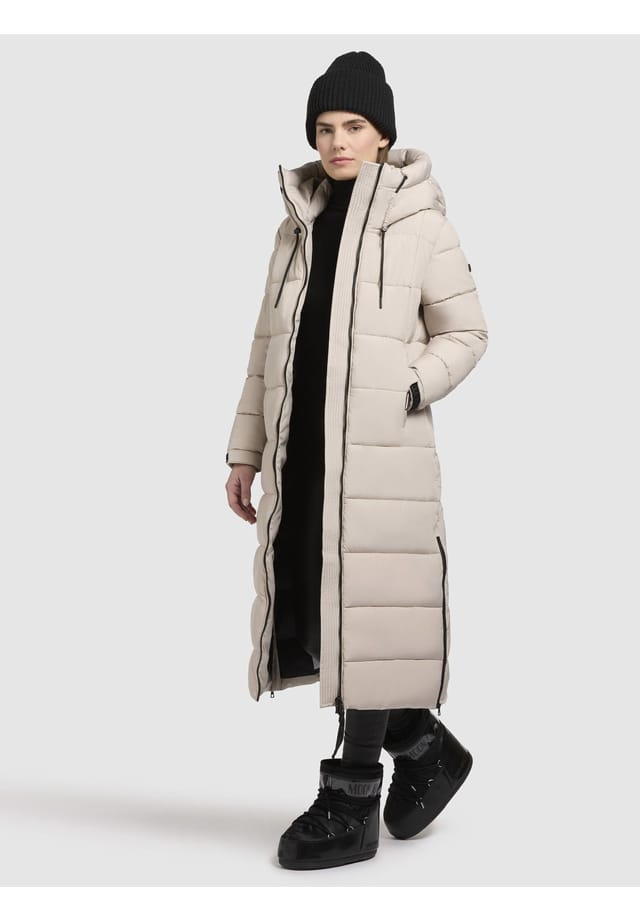 Удлиненное женское стеганое пальто с регулируемым капюшоном.