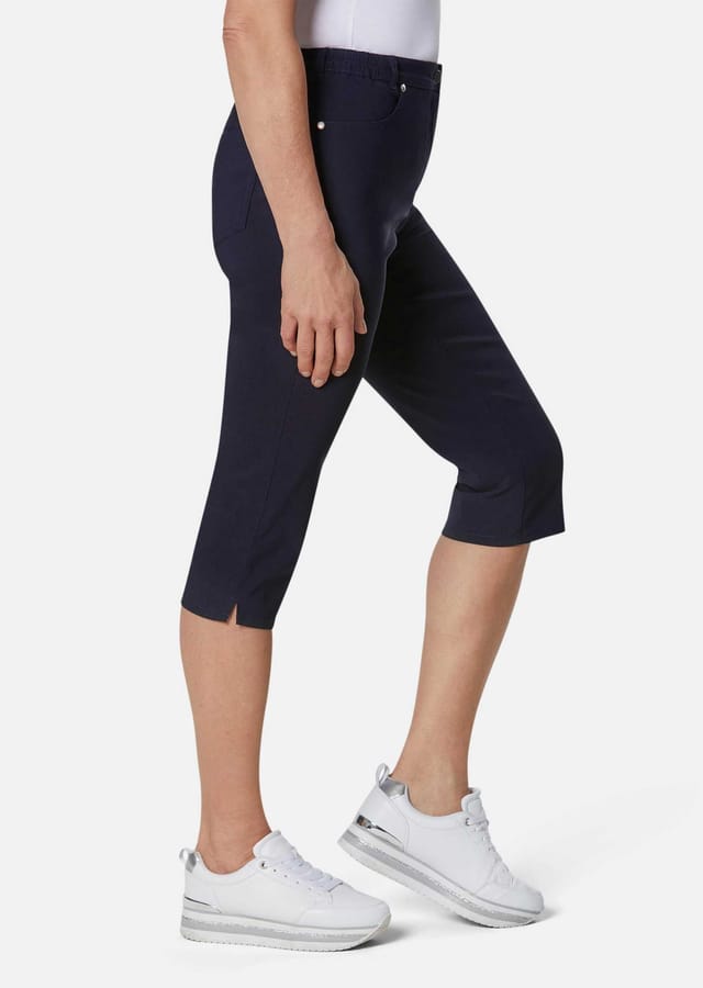 Описание товара: Брюки CARLA super-stretch и брюки-капри super-stretch идеально сидят: ничего не жмет и не сдавливает. Эффект супер-стрейча инновационного состава материала позволяет им двигаться при каждом движении. Эти универсальные модели би-эластичные, не мнется, подходят для переноски чемоданов и невероятно просты в уходе. Удобный пояс с регулируемой шириной талии обеспечивает первоклассный комфорт. Застегиваются спереди на молнию и пуговицу. Ширина подола брюк около 40 см, капри около 38 см. Ширина прямых штанин.