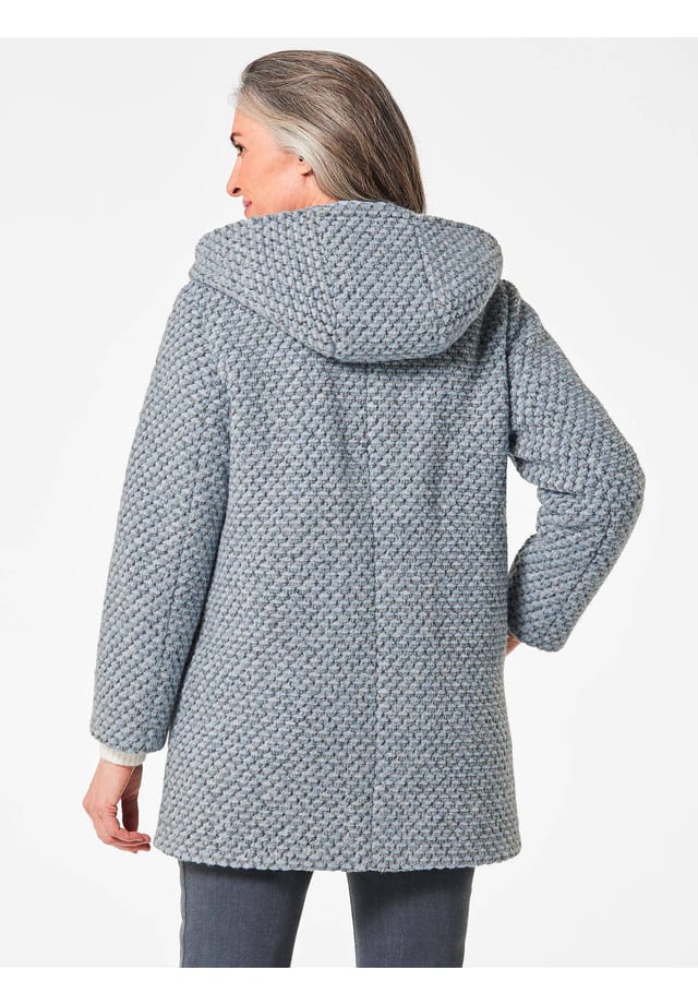 Описание товара: Пальто, которое привлекает внимание своим гармоничным двухцветным внешним видом. Содержание шерсти и легкая подкладка из переработанного материала обеспечивают уютное тепло. Щедрый капюшон обеспечивает дополнительную защиту от ветра и холода. Пальто застегивается на большие кнопки и имеет два внутренних кармана на подкладке. Большие прорезные карманы сохраняют руки в тепле. Модный компаньон для прохладных осенних дней. Длина около 85 см для размера 46, около 81 см для размера 23.