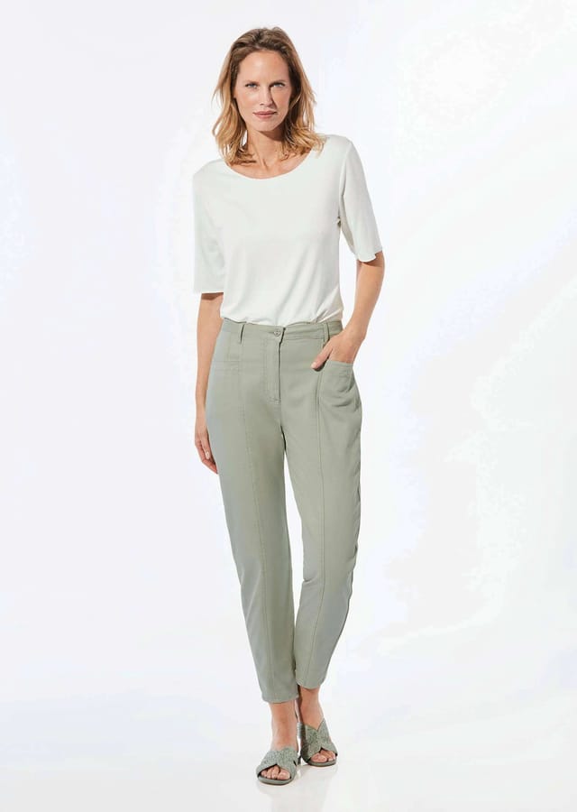 Описание товара: Укороченные брюки с фигурным поясом, шлевками для ремня, металлической джинсовой пуговицей и молнией. Тональная прострочка создает спортивный вид. Спереди между разделительными швами расположены прорезные карманы, а также эластичные вертикальные швы. Сзади — кокетливая седельная кокеточка и задние карманы. Повседневная ширина штанины сужается к узкому подолу, создавая современный силуэт. Мягкая, эластичная, удобная ткань из хлопка и лиоцелла для охлаждения и комфорта. Ширина подола около 34 см. Узкая ширина штанины.