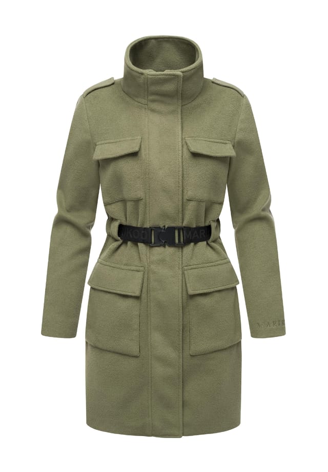 Женское короткое пальто из шерсти с поясом на талии.