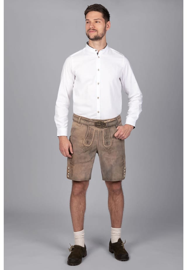 Описание товара: Короткие брюки из кожи дикой козы Lukas впечатляют высококачественными материалами и классическим дизайном. Прочная кожа дикой козы стильного коричнево-серого оттенка обеспечивает удобную посадку и изысканный внешний вид. Изящная вышивка и пуговицы с эффектом рога подчеркивают традиционный вид. В комплект входит соответствующий традиционный ремень с эмблемой оленя. Благодаря практичному карману для ножа с правой стороны эти кожаные брюки не только стильные, но и функциональные — идеально подходят для традиционных фестивалей и общественных мероприятий. Будь то Октоберфест или уютный визит в пивной сад — с этими кожаными брюками вы всегда будете одеты соответствующим образом. Общая длина: 50-52 см (измеряется от пояса до конца штанины, на основе размера 52)