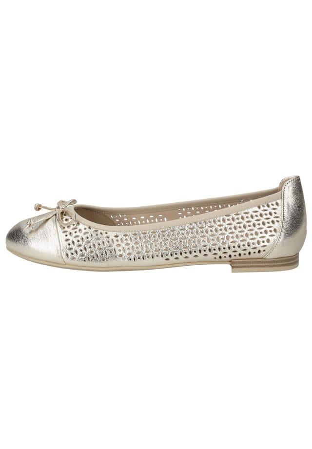 Описание товара: Красивые балетки от Caprice. Эта модель изготовлена из дышащей и эластичной кожи с металлическим эффектом и декоративным бантом на мыске. Вырезы на этой обуви — абсолютная приманка для глаз. Регулирующая влажность кожаная стелька, которую можно заменить по мере необходимости, обеспечивает приятный климат для ног.