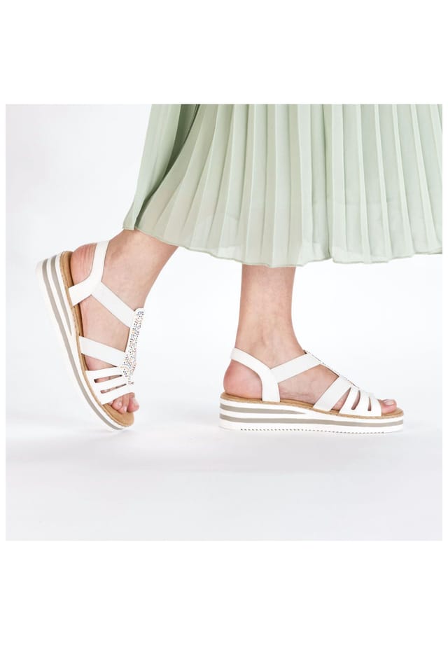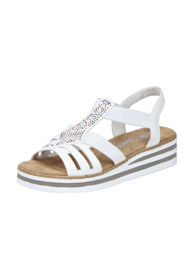 Описание товара: Эти удобные босоножки на танкетке от RIEKER действительно привлекают внимание благодаря красивым каменным украшениям на центральной планке. Босоножки быстро и легко надевать и снимать благодаря эластичным ремням. Мягкая и влагорегулирующая текстильная стелька и клиновидная подошва, которая обеспечивает удобную высоту для ходьбы, обеспечивают дополнительный комфорт.