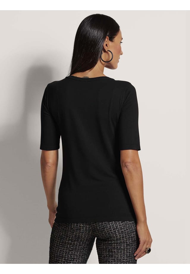 Описание товара: Базовая вещь, которая просто необходима летом! Эта базовая рубашка имеет облегающий крой с круглым вырезом и узкими рукавами-полутора. Благодаря эластичности вискозы рубашка сохраняет форму и проста в уходе. Комбинированная рубашка с неограниченной универсальностью! Вискоза в этой модели — это натуральный материал из возобновляемых лесов.