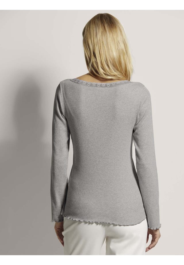 Описание товара: Наша ребристая рубашка из красивой меланжевой ткани обеспечивает максимальный комфорт. Изготовленная из приятной мягкой, эластичной пряжи, она идеально адаптируется к вашему телу. Классический круглый вырез и длинные рукава делают ее универсальным компаньоном для любого случая. Особенно очаровательно: нежная кружевная отделка, которая придает этой рубашке женственность. Идеально подходит для стильного и удобного повседневного образа.