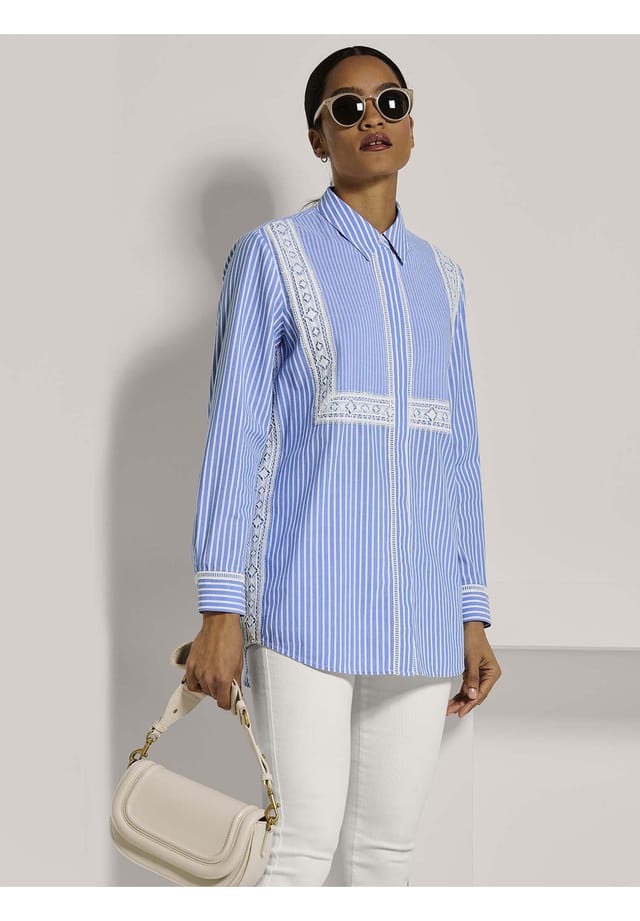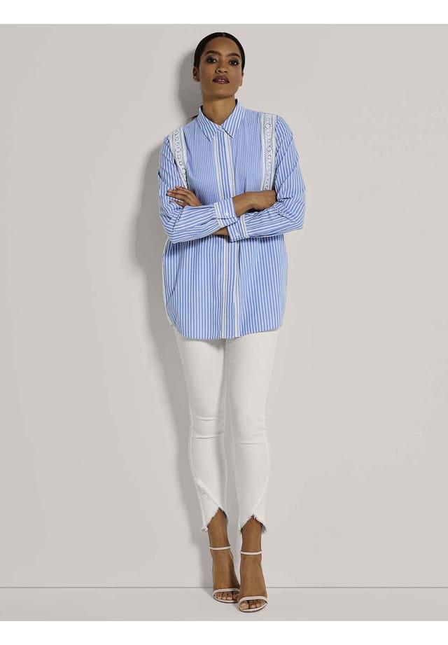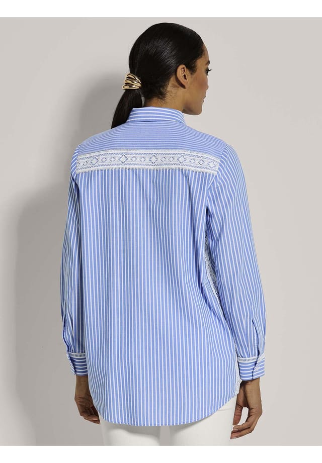 Описание товара: Свежий образ, который очаровывает своим романтическим акцентом. Эта блузка свободно обтекает современные образы со средиземноморским шиком и удобна в носке. Она свободно облегает фигуру и позволяет большому количеству воздуха достигать кожи. Фасон с нашивками, который создает переполох с помощью окрашенной пряжей полоски и элегантного кружева, добавляя изюминку любому наряду. Скрытая планка с пуговицами блузки-рубашки отличается стильной сдержанностью и привлекает внимание к самому необходимому. Длинные рукава с манжетами на пуговицах, закругленный подол и задняя кокетка, подчеркнутая кружевом, завершают стиль.