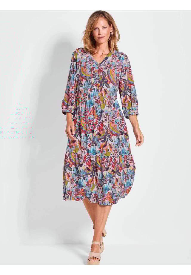 Описание товара: Платье с женственным цветочным принтом в ярких тонах — жизнерадостная приманка для глаз в этом сезоне! Мягкая, струящаяся вискозная ткань прекрасно подчеркивает расклешенную многоярусную юбку. V-образный вырез с короткой планкой на пуговицах и разделительный шов на талии подчеркивают женственный силуэт. Карманы в боковых швах и рукава длиной 3/4 с эластичным поясом — идеально подходят для подбора любимой одежды. Модель без подкладки легкая и воздушная, и в ней комфортно во всех отношениях! Длина около 112 см для размера 46, около 112 см для размера 46. 106 см в размере 50. 23.
