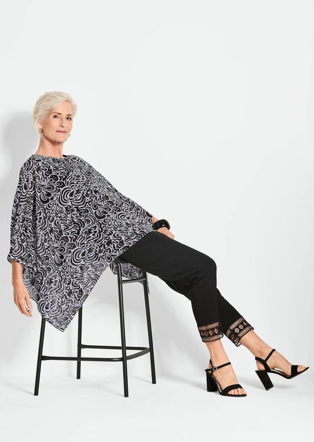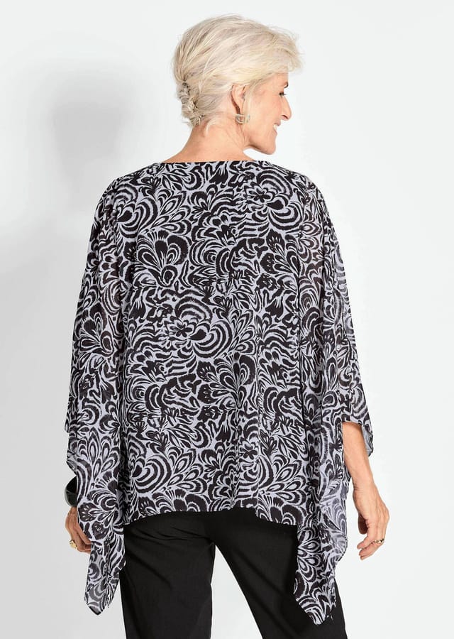 Описание товара: Блузка с запахом, которая искусно облегает силуэт. Полупрозрачный шифон удивительно легкий и колышется при каждом движении. Подкладка из трикотажного верха делает блузку непрозрачной и удобной для ношения. Качество, не требующее особого ухода. Благодаря высококонтрастному принту она действительно привлекает внимание! Длина около 66 см для размера 46, около 62 см для размера 23.