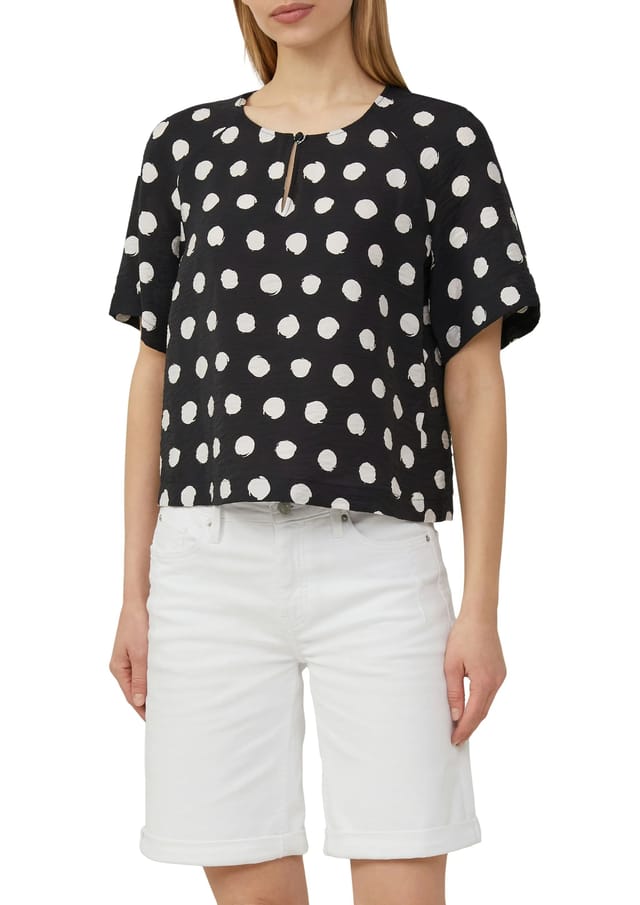 Особенности : Вырез-замочная скважина придает блузке современный элегантный акцент. Прямой крой гарантирует удобную посадку в любом случае. Стильный повседневный образ идеально подходит для универсальных сочетаний. Покрой: Прямой. Вырез: Замочная скважина. Длина рукава: Короткий рукав. Обозначение длины топа: Обычная длина.