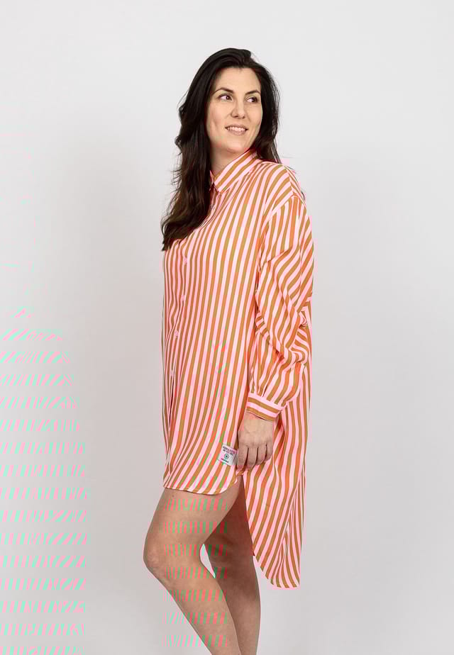 Описание товара: Платье-блуза свободного кроя с полосками и планкой на пуговицах. Цвет корпуса: бежево-коралловый.