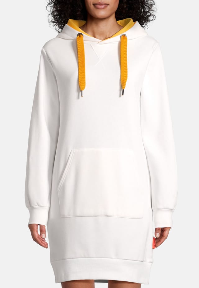 Описание товара: Классическое платье с капюшоном с манжетами на рукавах и подоле и накладным карманом. Красочные желтые акценты на шнурке и капюшоне, а особенно большой принт «Be Yourself» на спине, делают это платье настоящим фаворитом.