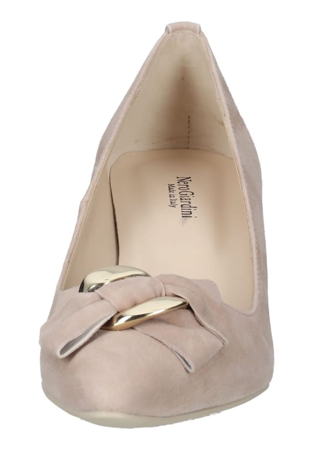 Описание товара: Nero Giardini представляет классические туфли-лодочки из высококачественной замши. Заостренный носок и симпатичный бант с металлическим кольцом дополняют модель. Мягкая стелька обеспечивает дополнительную дозу комфорта.