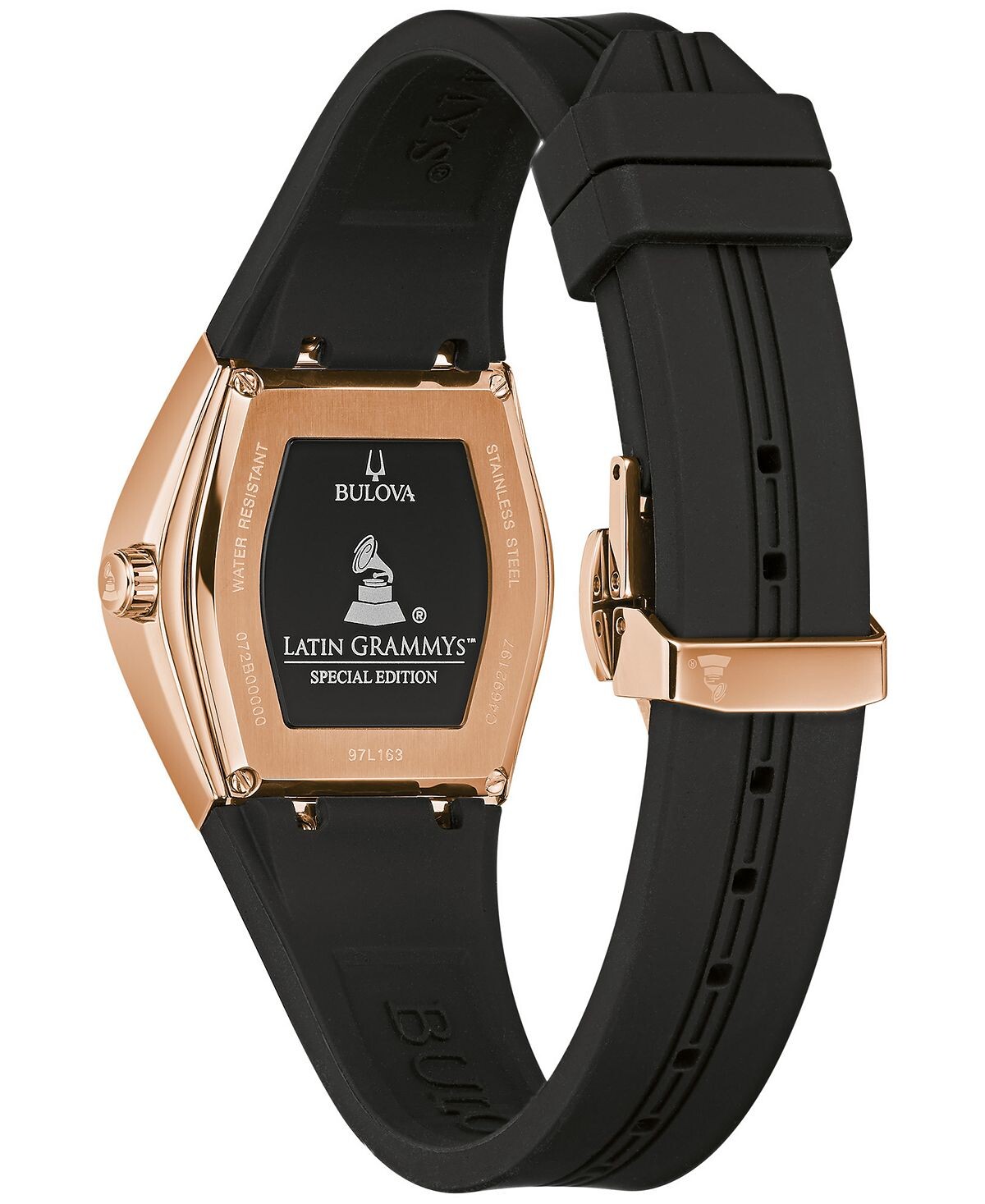 Эти инновационные часы, посвященные Латинской Грэмми, имеют уникальный угловатый корпус, переходящий в мягкий черный силиконовый ремешок. Полированные акценты оттенка розового золота подчеркивают великолепный циферблат.