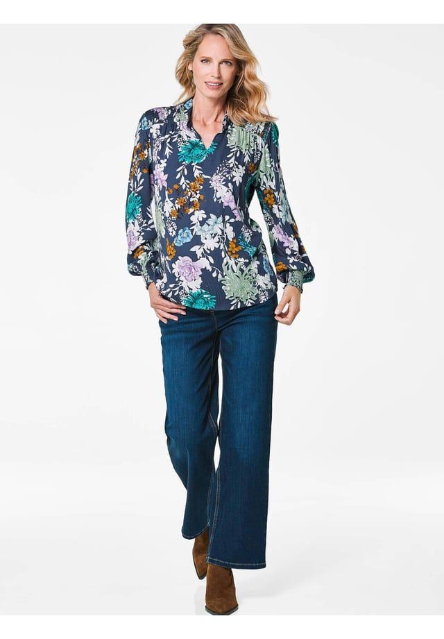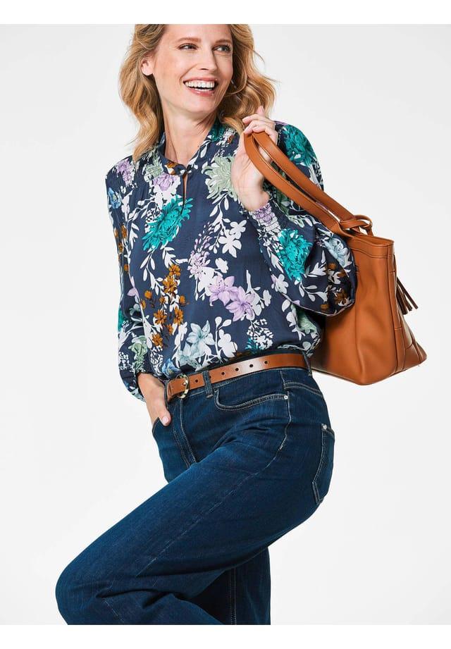 Описание товара: Блузка с контрастным цветочным принтом по всей поверхности для женственного образа. Мягкая, струящаяся вискозная ткань особенно удобна в носке, а крой до бедер и удобная дополнительная ширина придают ей непринужденный вид. Воротник-стойка с пуговицей и эластичной петлей, а небольшой разрез на линии горловины гарантирует, что блузку легко надевать и снимать. Присборенная кокетка спереди и присборенные манжеты на рукавах — изысканные детали. Длина около 66 см для размера 46, около 62 см для размера 23.