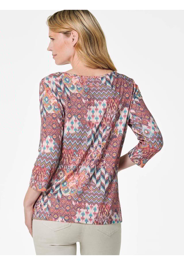 Описание товара: Рубашка из особенно мягкого и удобного вискозного трикотажа. Захватывающий принт по всей поверхности легко комбинируется и добавляет нотку esprit к повседневной одежде. Вырез лодочкой и рукава длиной 3/4 искусно завершают эту симпатичную вещь. Длина около 64 см для размера 46, около 60 см для размера 23.