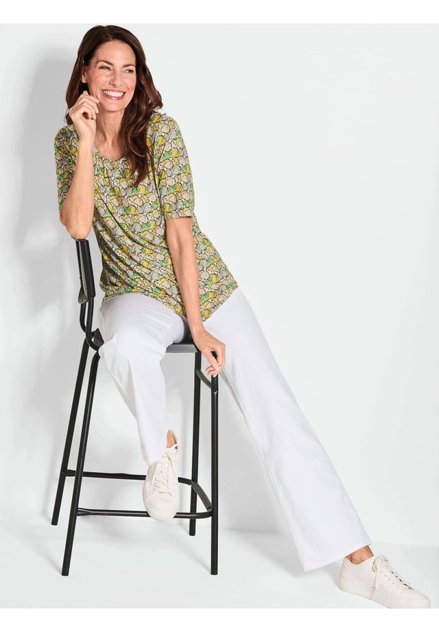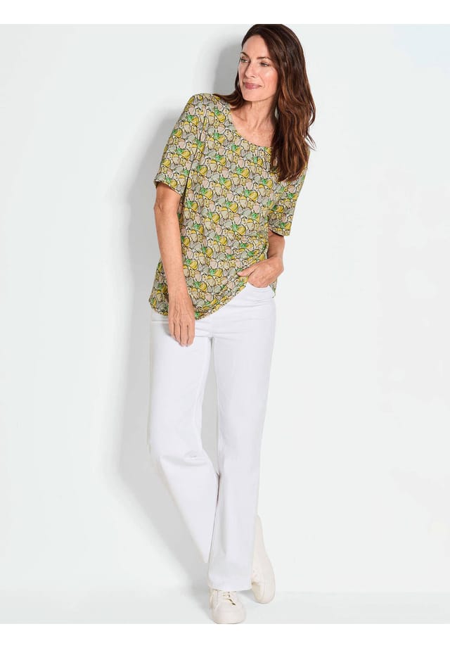 Описание товара: Рубашка в приятных свежих тонах — идеально подходит для нового сезона! Женственный круглый вырез горловины украшен модными плиссированными деталями. Благодаря повседневным коротким рукавам и модному принту эта очаровательная вещь наверняка станет любимой вещью в гардеробе. Высококачественный состав материала с большим количеством натуральной вискозы и эластичного эластана также обеспечивает максимальный комфорт. Длина около 66 см для размера 46, около 62 см для размера 23.