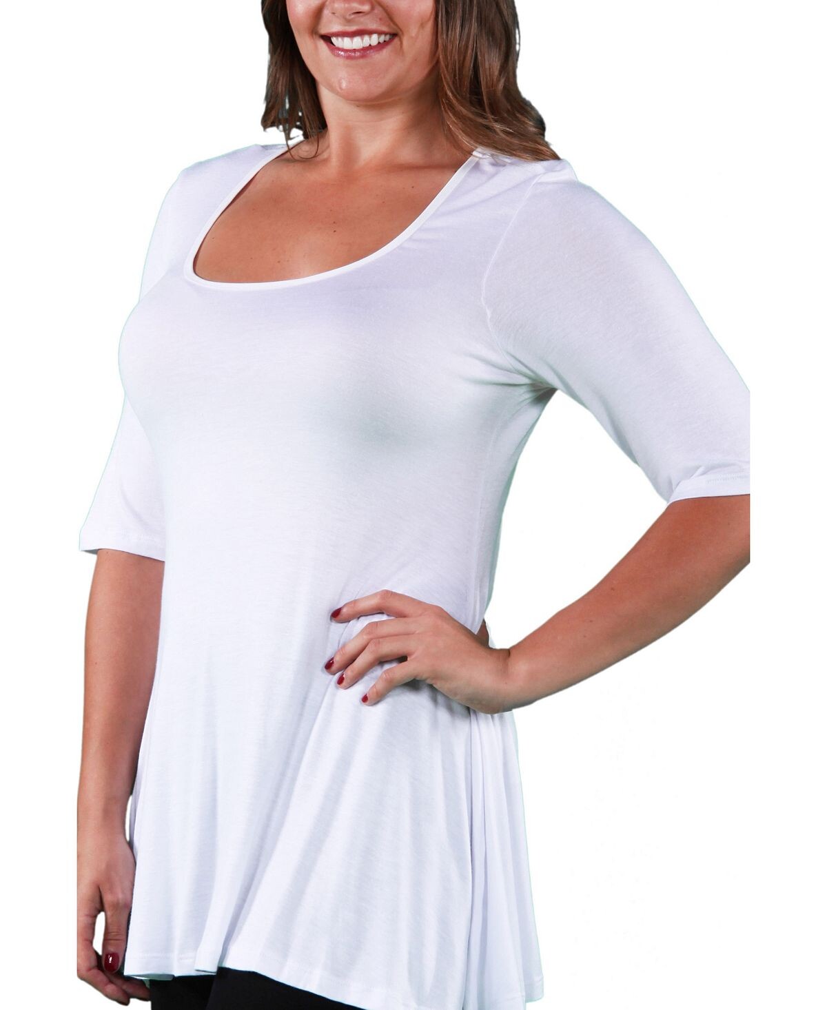 Этот топ-туника больших размеров от 24seven Comfort Apparel стильен и подойдет к любой фигуре. Этот топ доказывает, что меньше значит лучше: туника с однотонным принтом обязательно заявит о себе. Его можно украсить яркими аксессуарами для ночной прогулки по городу.