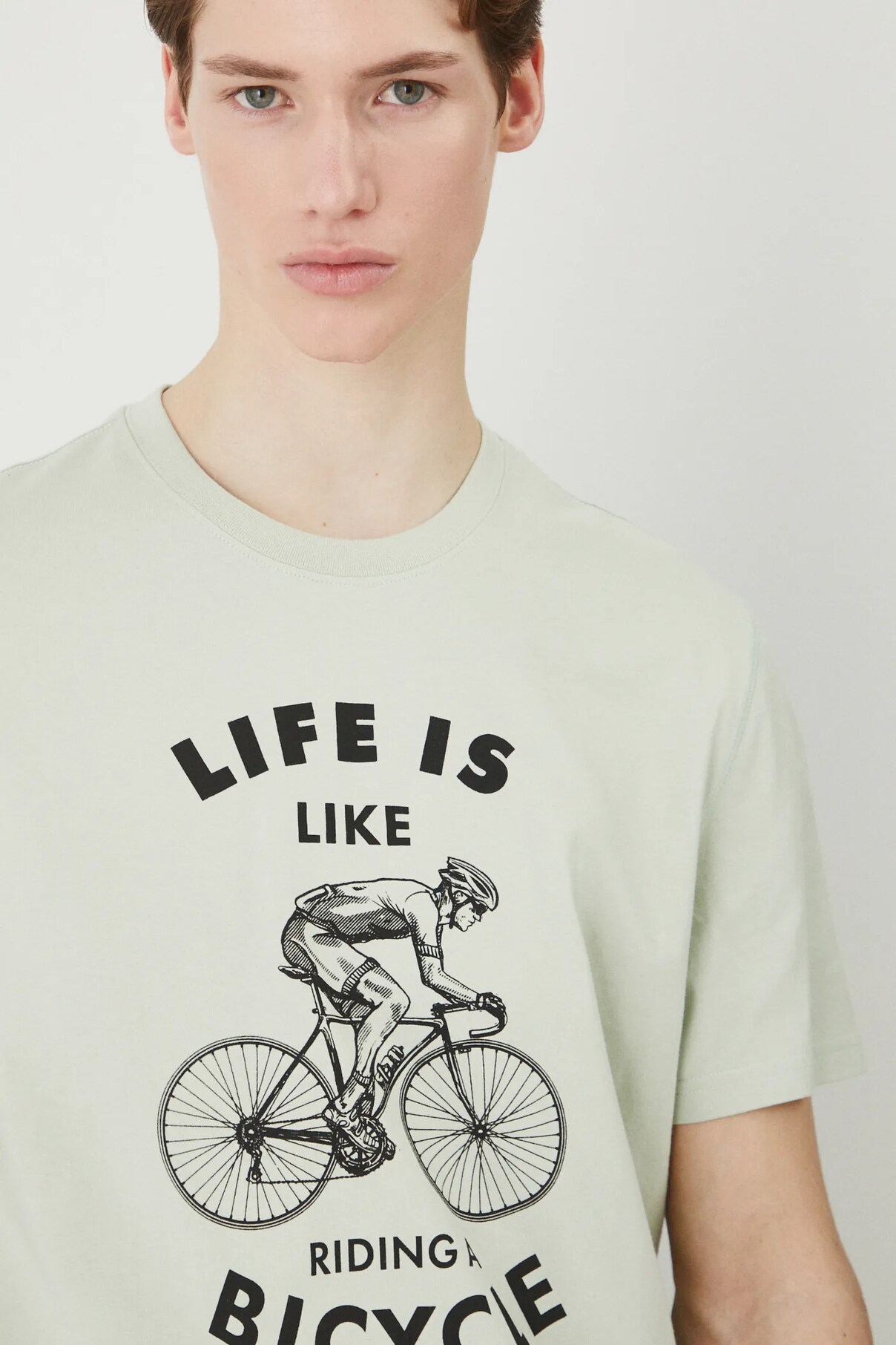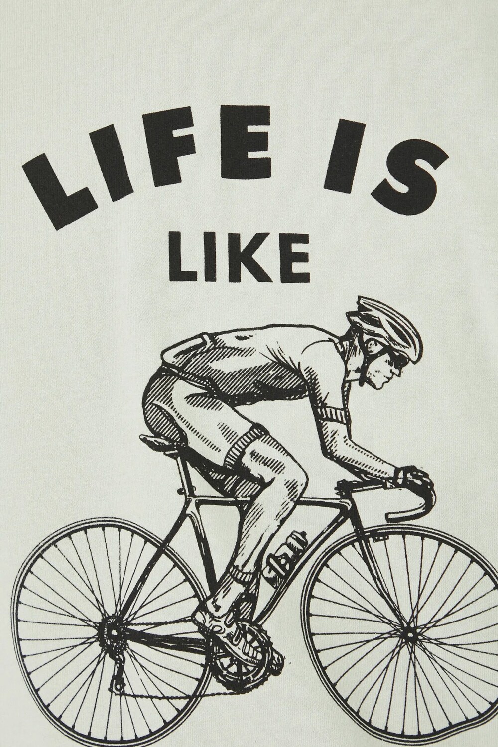 - Надпись на лицевой стороне: Жизнь как езда на велосипеде — чтобы сохранить равновесие, нужно постоянно двигаться.