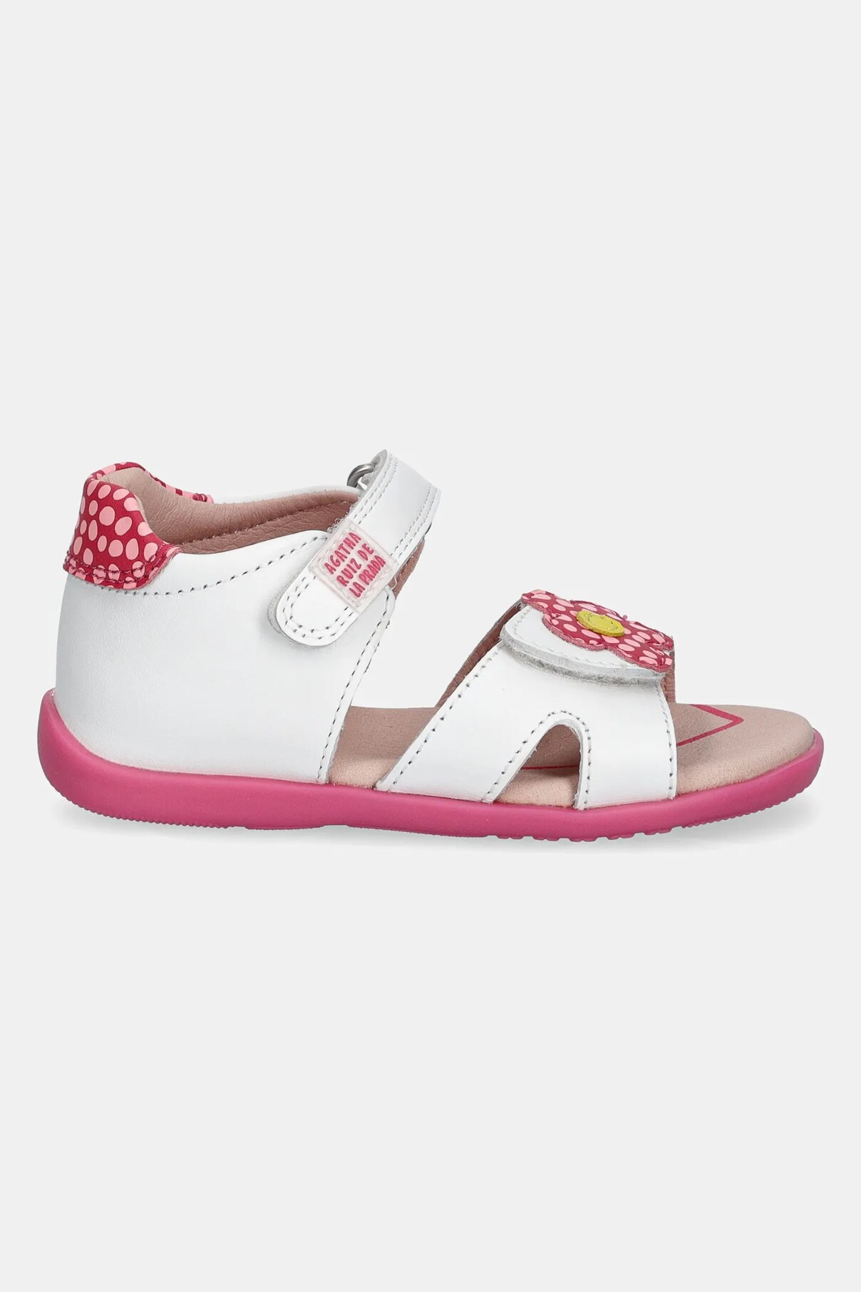 Детские сандалии из коллекции Agatha Ruiz de la Prada из натуральной кожи. Модель с резиновой подошвой, прочной и устойчивой к повреждениям.