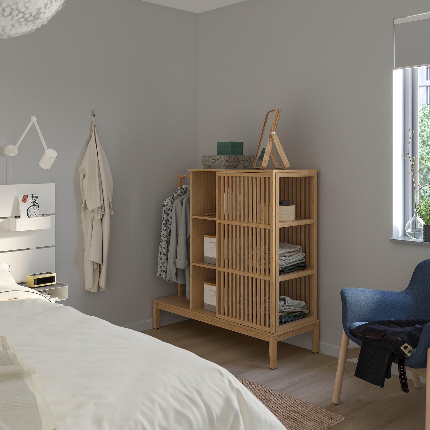Этот универсальный шкаф можно разместить у стены, у изножья кровати или в качестве разделителя комнаты.