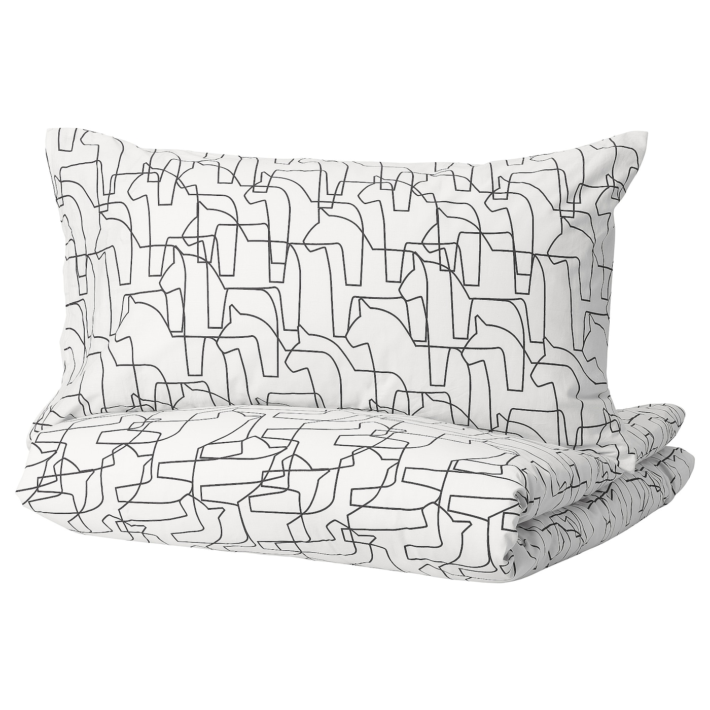 Забирайтесь в кровать и наслаждайтесь чудесно мягким хлопком. Этот пододеяльник с наволочкой идеально подходит для односпальной кровати. Часть коллекции HÄSTHAGE – текстиль с изображением шведской лошади породы далла.
