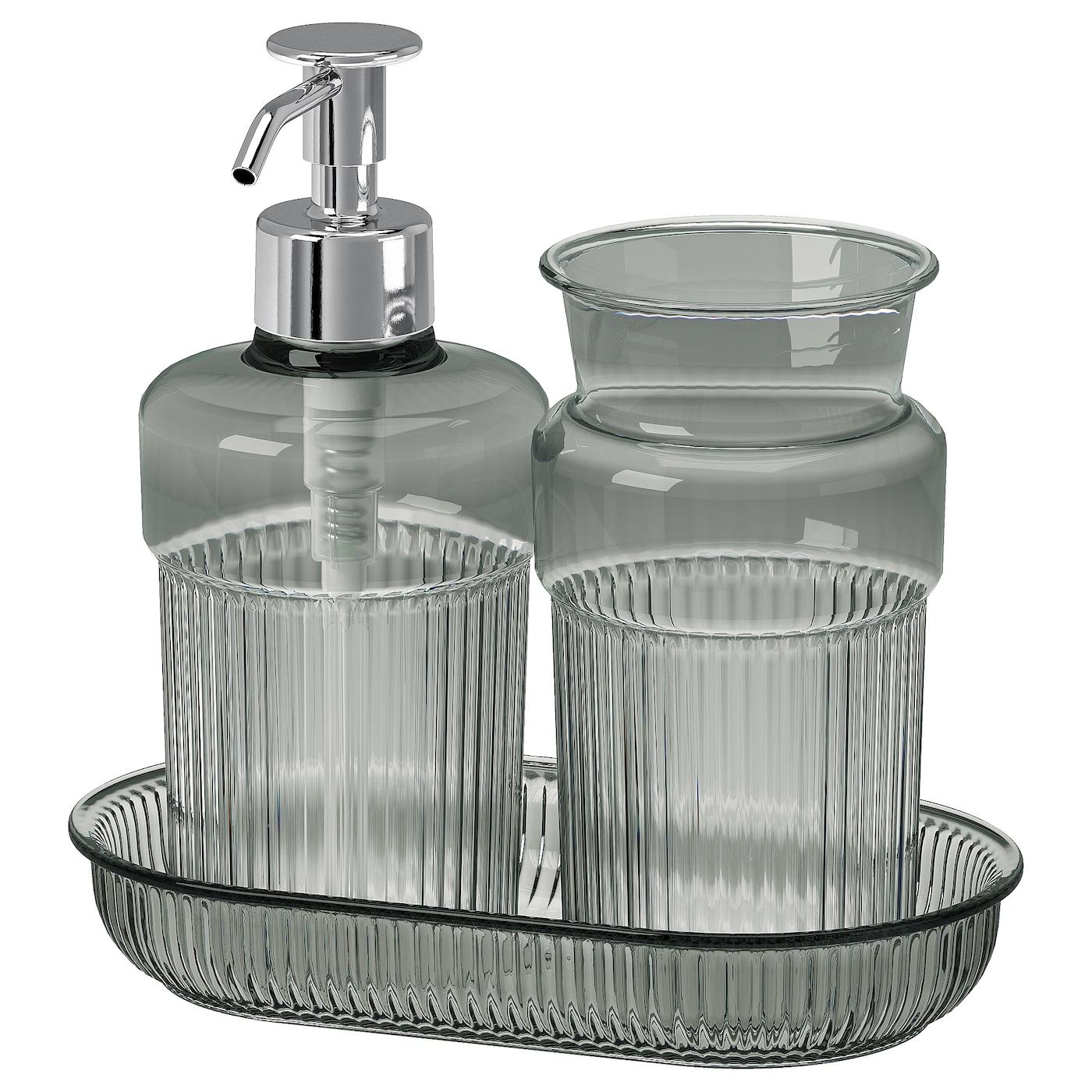 В комплект входят: 1 дозатор мыла, 33 мл (диаметр 7 см, высота 17 см), 1 подставка для зубных щеток (диаметр 7 см, высота 13 см) и 1 поднос (длина 18 см, глубина 10 см).