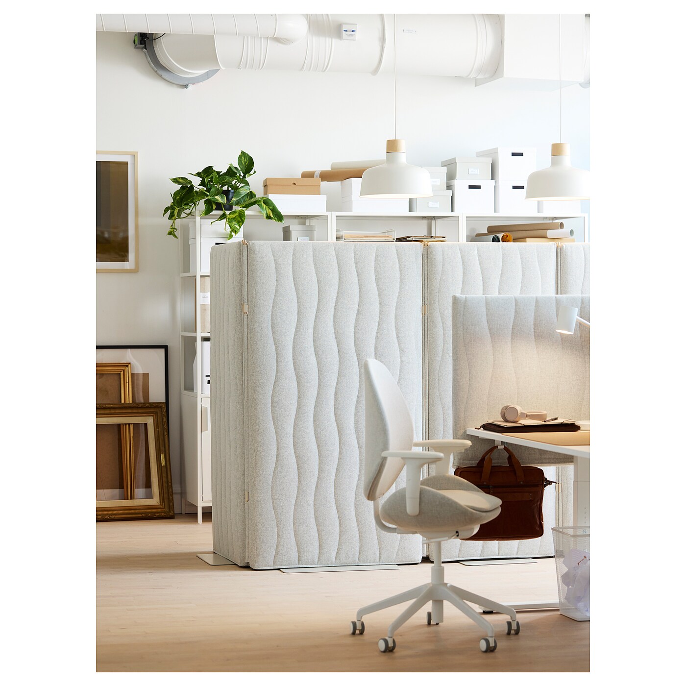 В офисном пространстве с гибкой планировкой можно создать новые рабочие зоны, соединив два или более напольных экрана с помощью закругленных деревянных стержней по бокам.