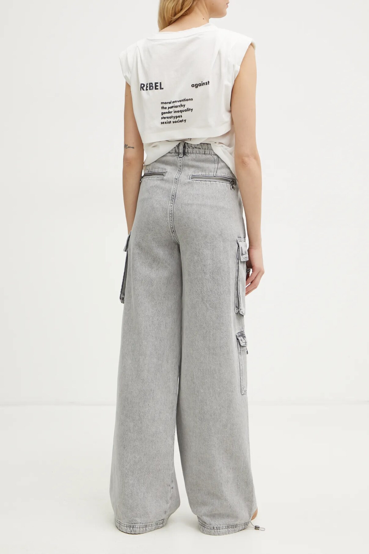 - Модель с высокой талией, застегивается на пуговицы и молнию. - Декоративно потертый деним. - Два накладных кармана спереди. - Карманы для груза обеспечивают дополнительное место для хранения мелких предметов. - Два кармана на молнии на ягодицах. - Ножки дополнены завязками для лучшей посадки. - Ширина талии: 40 см. - Ширина бедер: 45 см. - Высота талии: 28 см. - Ширина штанины внизу: 27 см. - Ширина штанины: 25 см. - Длина штанины по внешнему шву: 110 см. - Размеры указаны для размера: 27.