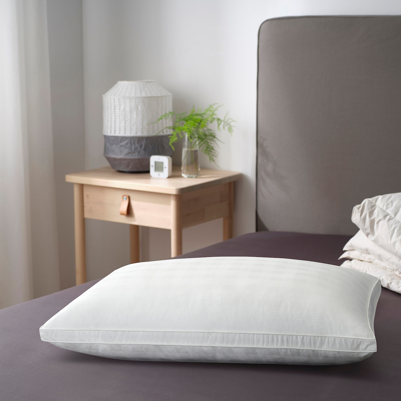Высокая, простая в уходе подушка из мягкой хлопчатобумажной ткани кареточного переплетения, наполненная полыми волокнами из переработанных материалов.