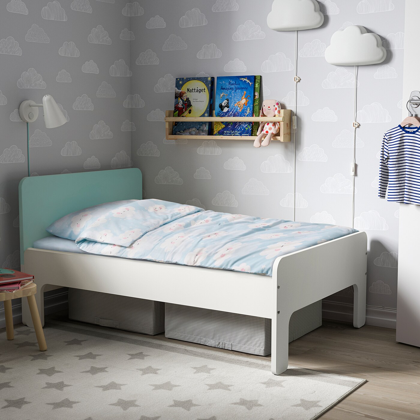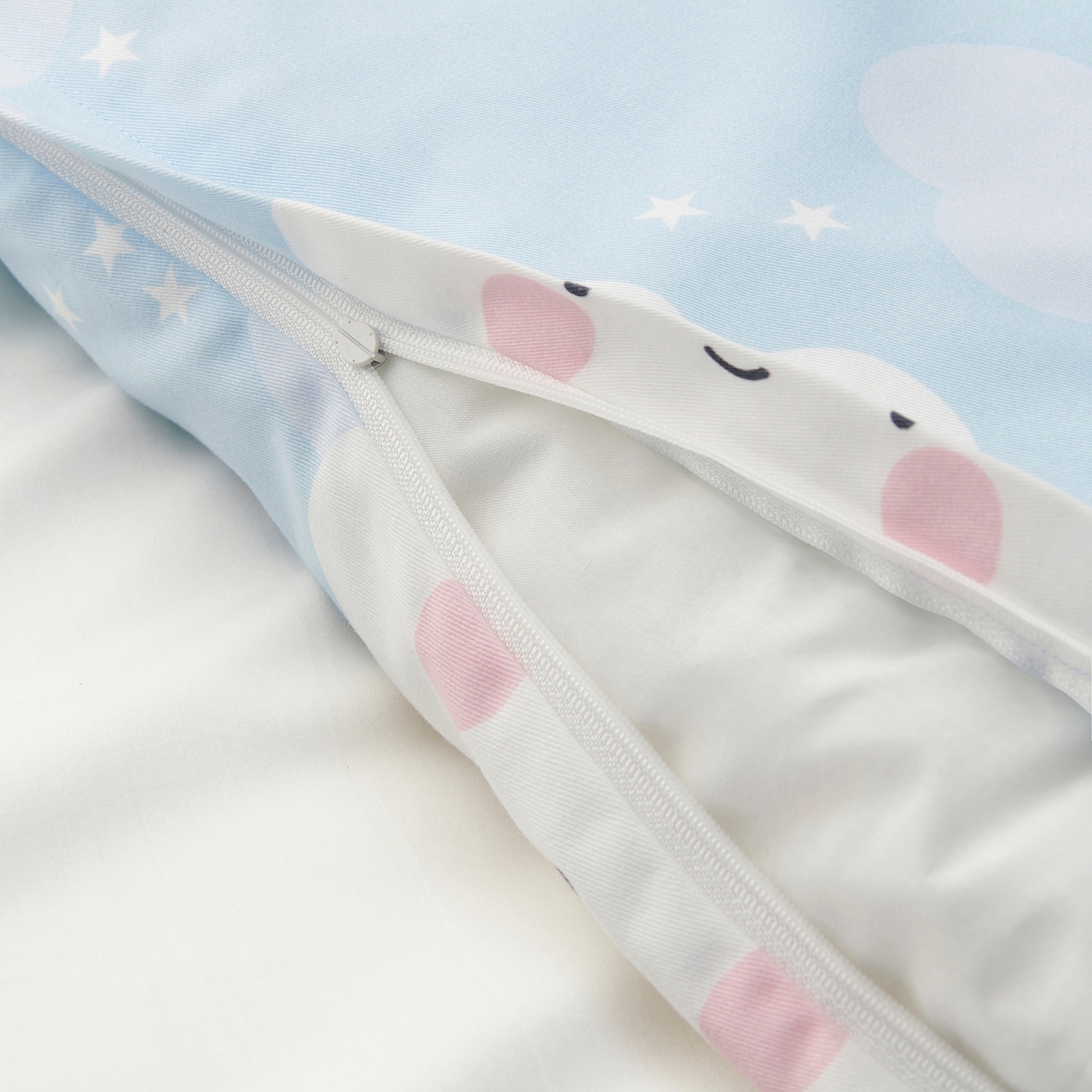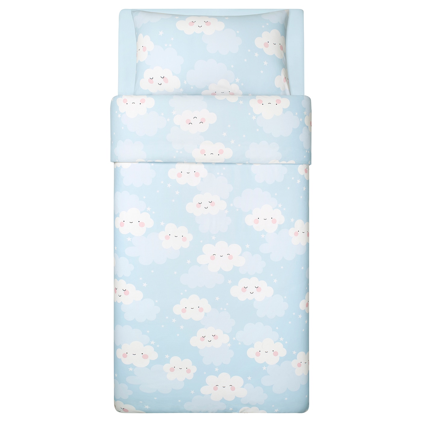 Милый мягкий пододеяльник и наволочка с пушистыми белыми облаками на светло-голубом фоне. Плотная хлопковая/лиоцельная ткань, которая дышит и приятно охлаждает кожу вашего ребенка всю ночь.