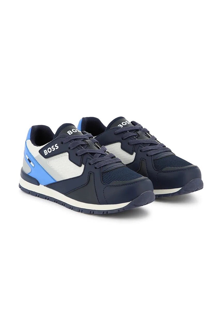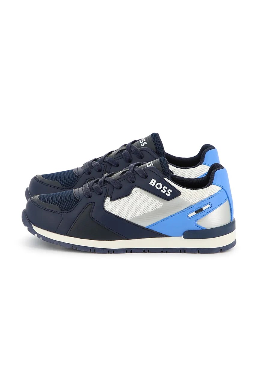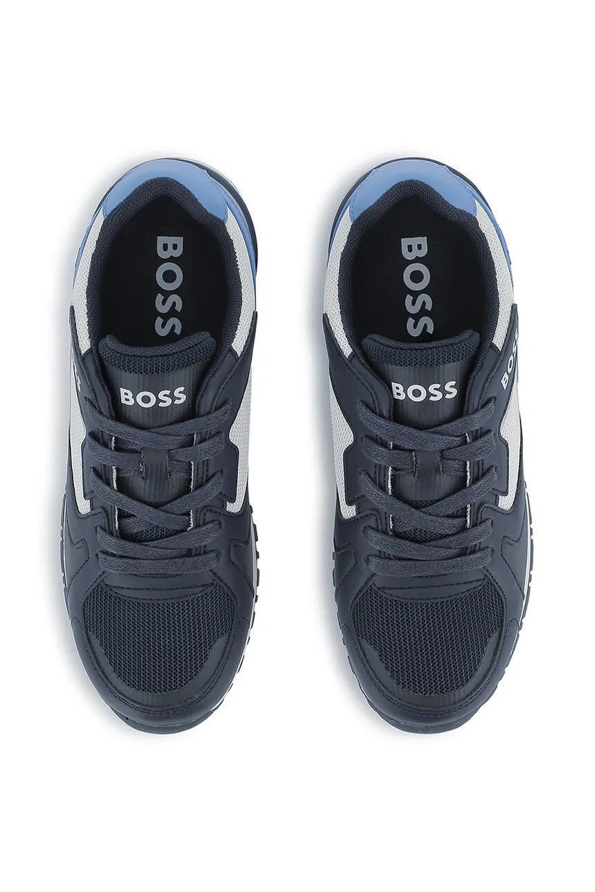 Детские кроссовки из коллекции BOSS. Модель выполнена из комбинации экологической кожи и текстильного материала.