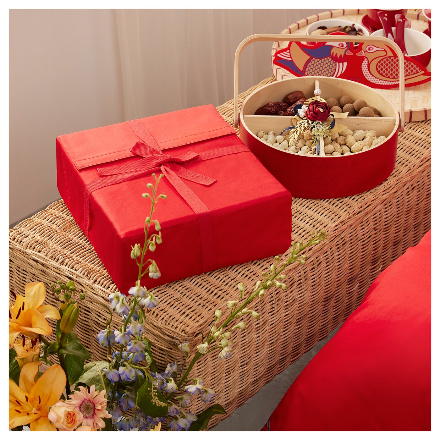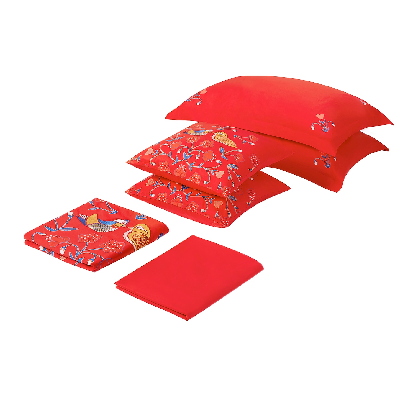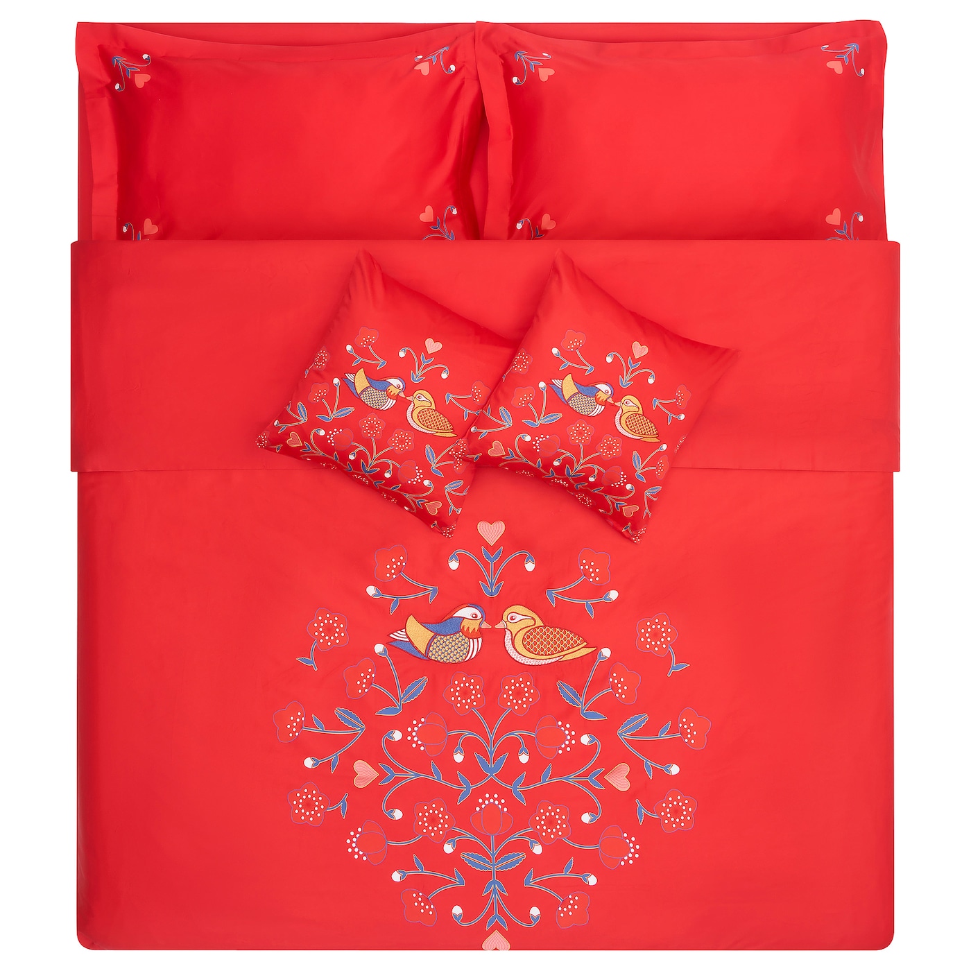 Комплект постельного белья с вышитыми сердцами и мандаринками, китайским символом вечной любви, окруженным красочным узором. Идеальный подарок для молодоженов, вдохновленный шведской картиной курбитов.