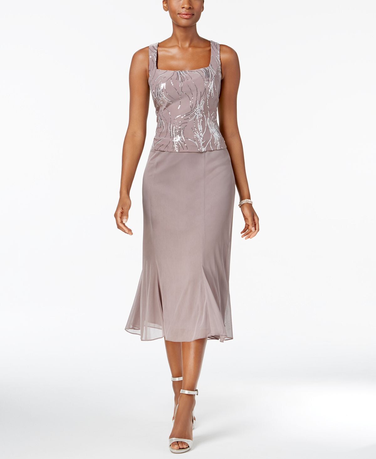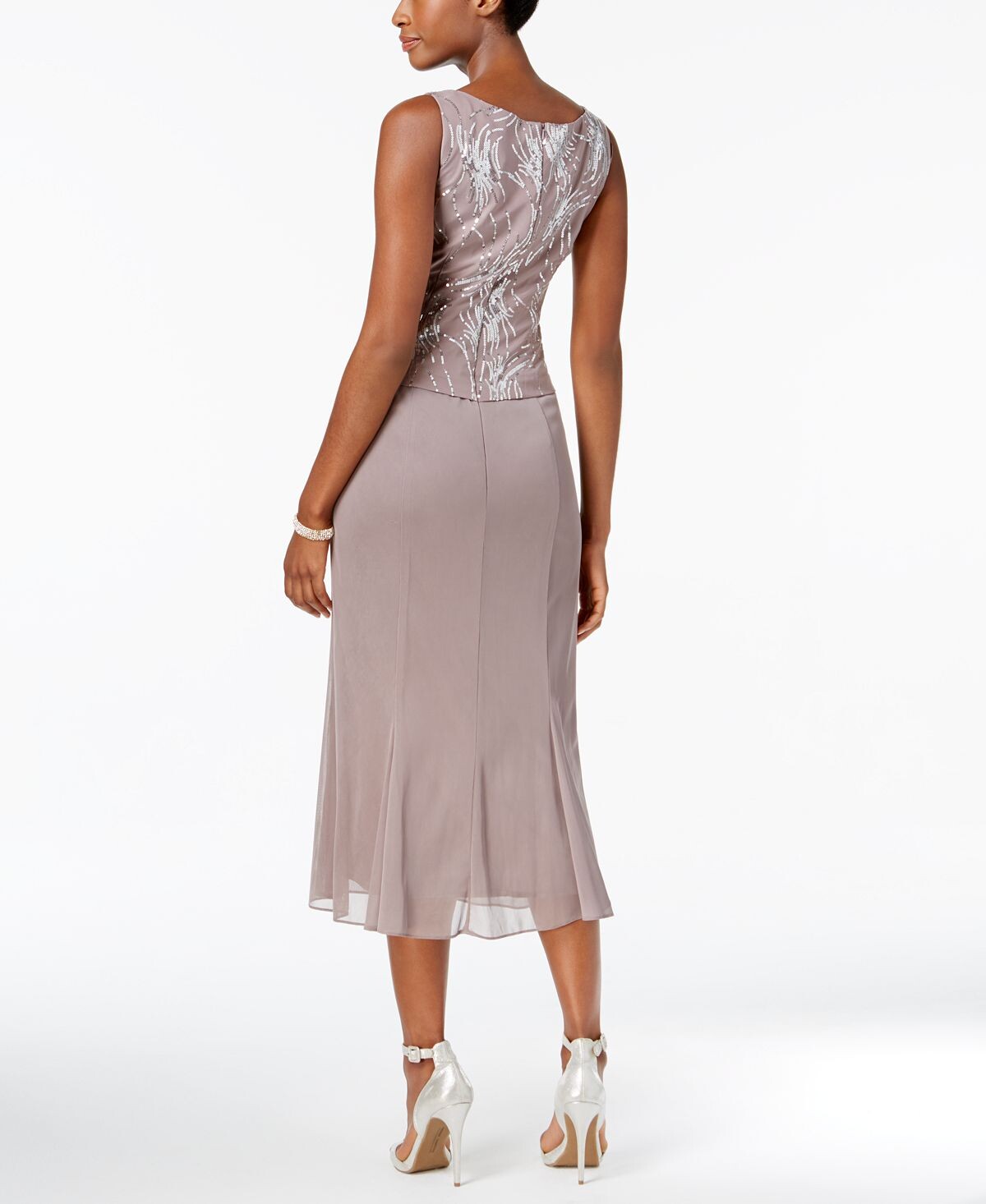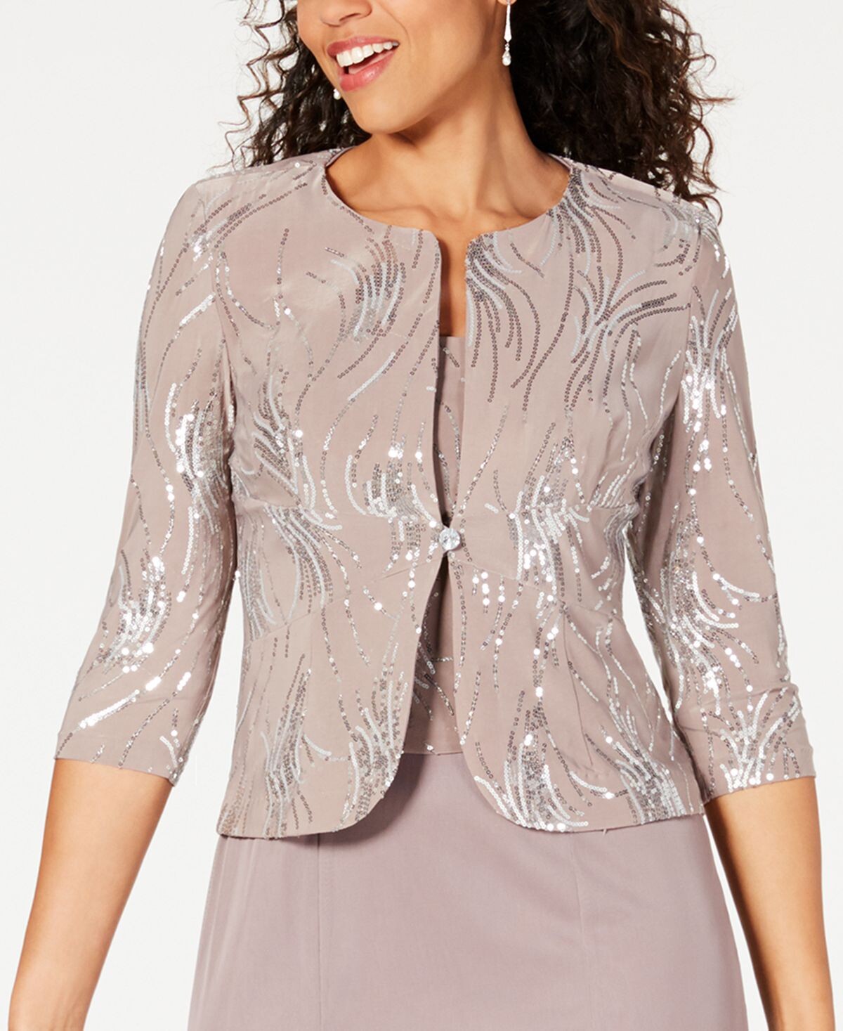 Завитки пайеток добавляют драматизма потрясающему формальному ансамблю Alex Evenings, в котором вечернее платье длиной до пола сочетается с подходящим приталенным жакетом. Перевернутые шифоновые складки создают движение на танцполе!