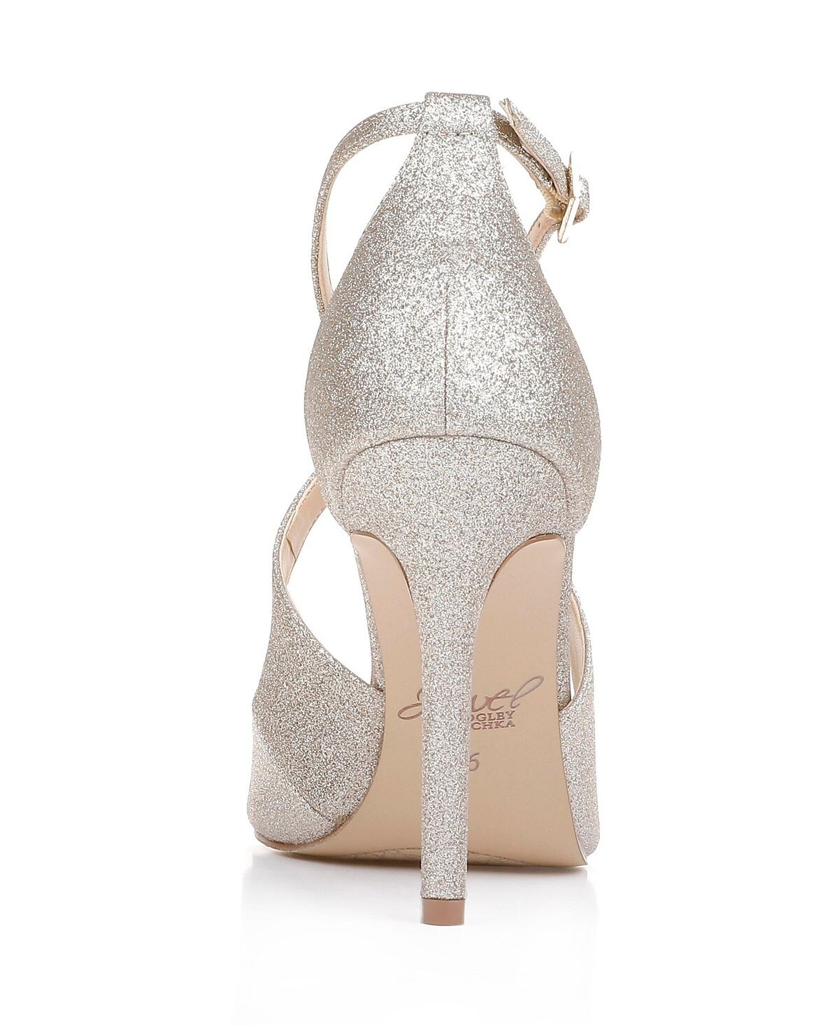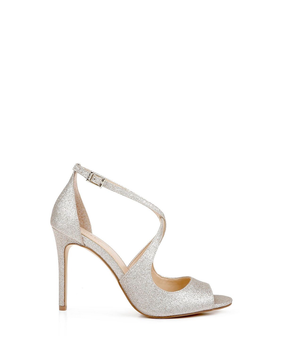 Тонкий, инкрустированный блестками каблук-шпилька придает модную привлекательность великолепным блестящим сандалиям, дополненным зауженными перекрещивающимися ремешками.