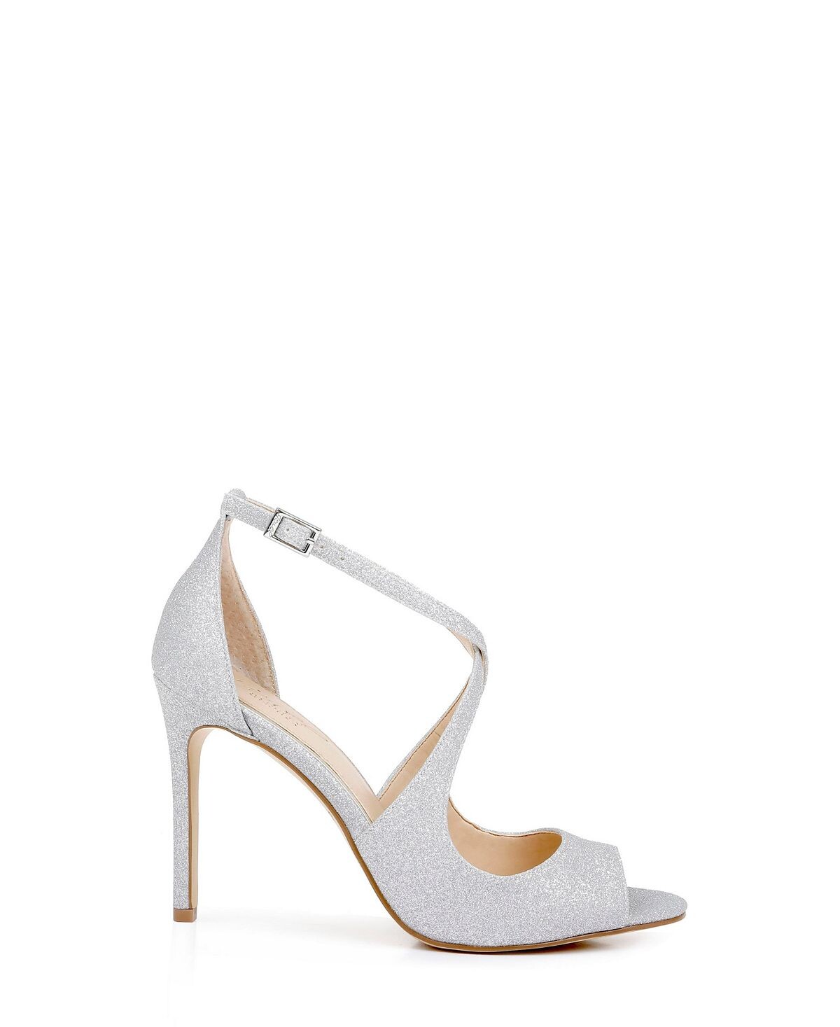 Тонкий, инкрустированный блестками каблук-шпилька придает модную привлекательность великолепным блестящим сандалиям, дополненным зауженными перекрещивающимися ремешками.