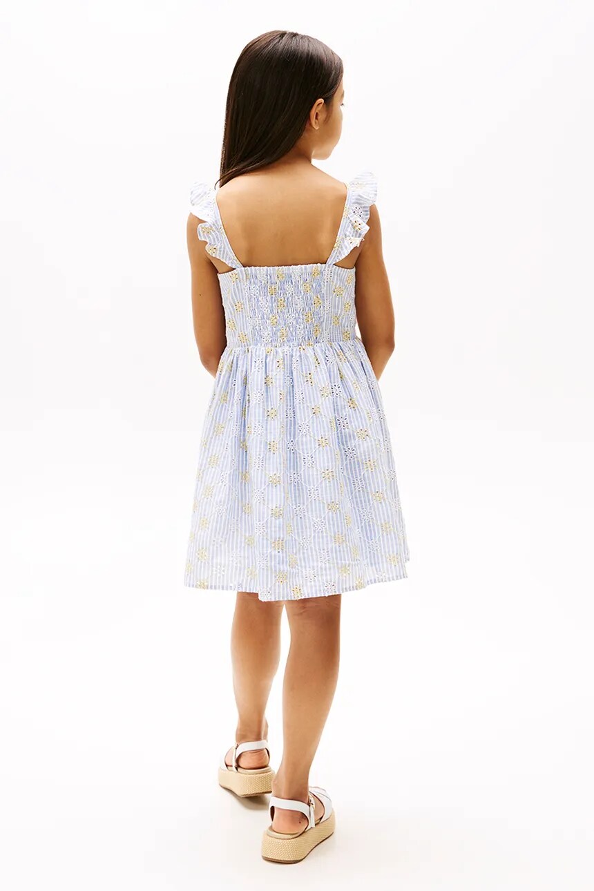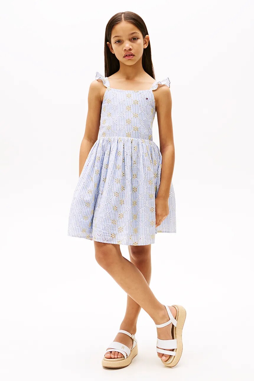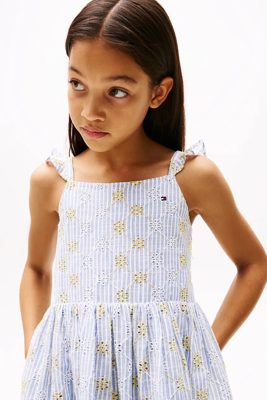 Детское платье из коллекции Tommy Hilfiger. Расклешенная модель из узорчатой ​​ткани. Хлопок, приятный на ощупь материал.