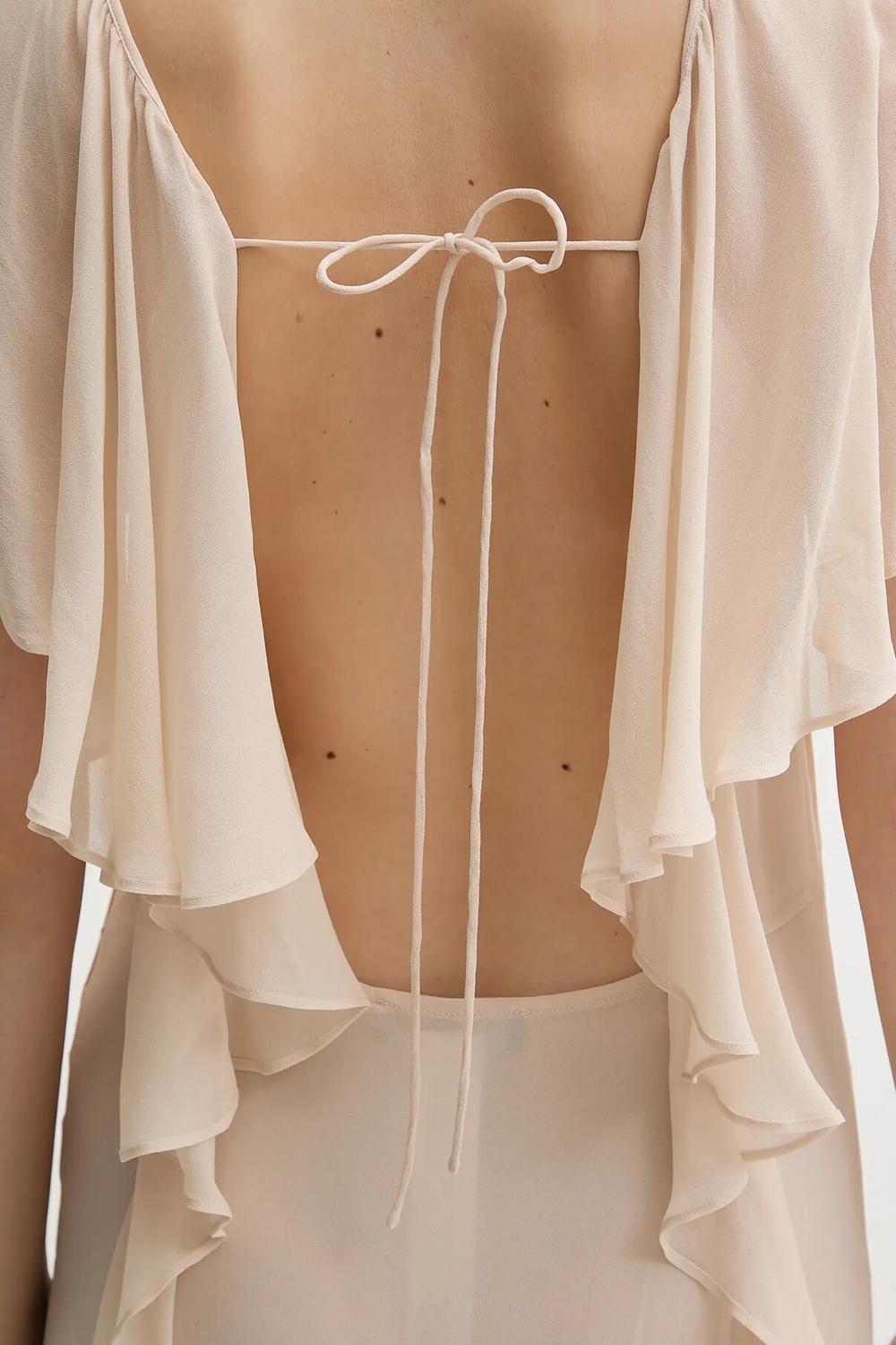 - Чехол из текстильного материала, обеспечивающий защиту во время путешествия. - Расклешенный крой. - Острый вырез. - Застежка-кнопка. - Короткий рукав. - Модель с декоративными оборками. - Привлекательные разрезы. - Длина: 150 см. - Ширина под мышками: 40 см. - Размеры указаны для размера: 36.
