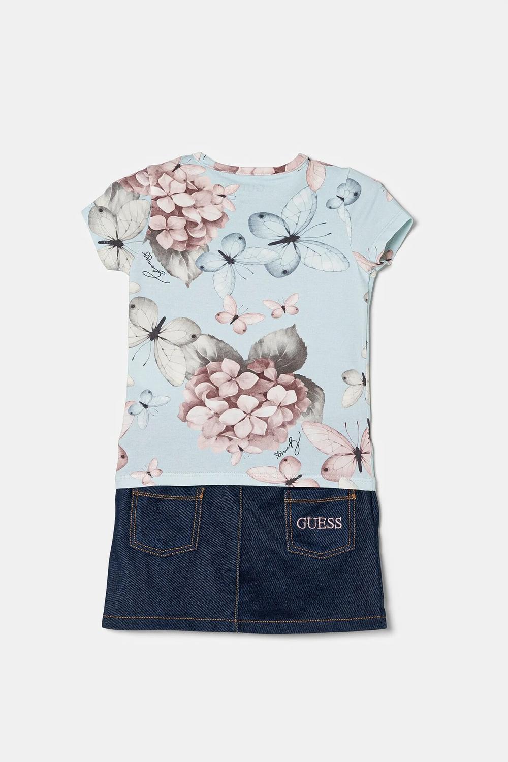 Детский комплект из коллекции Guess. Модель выполнена из комбинации трикотажа и ткани.