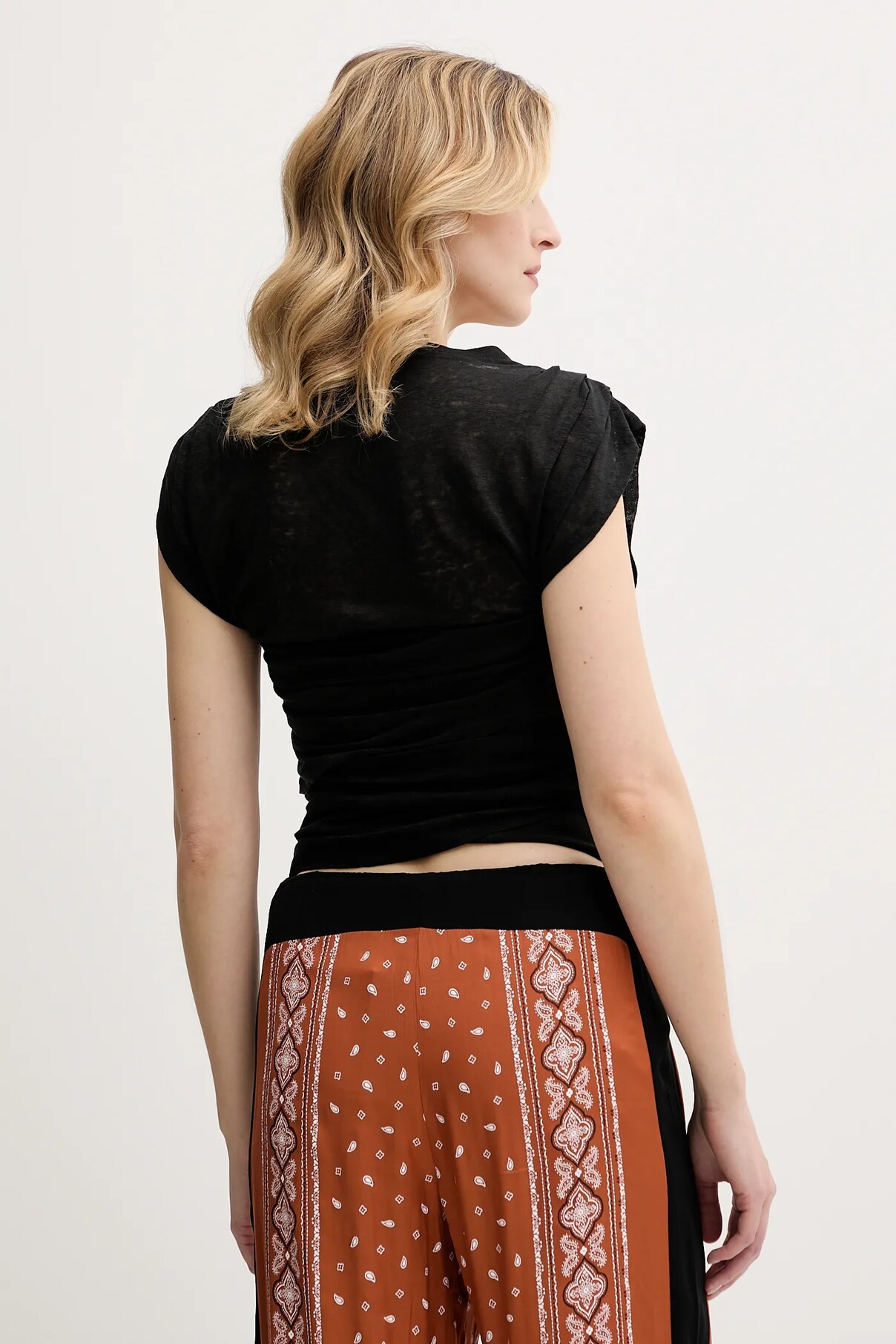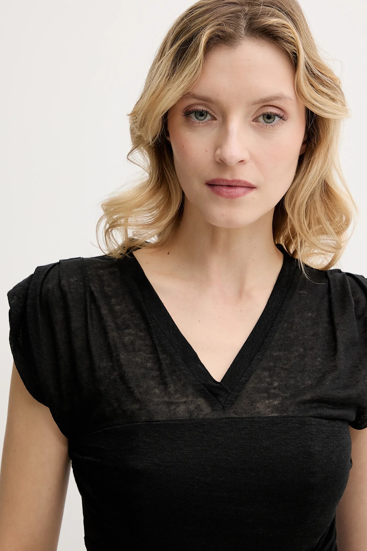 Блузка из коллекции Pinko, выполненная из комбинации двух разных материалов. Модель из воздушного материала с высоким содержанием льна.