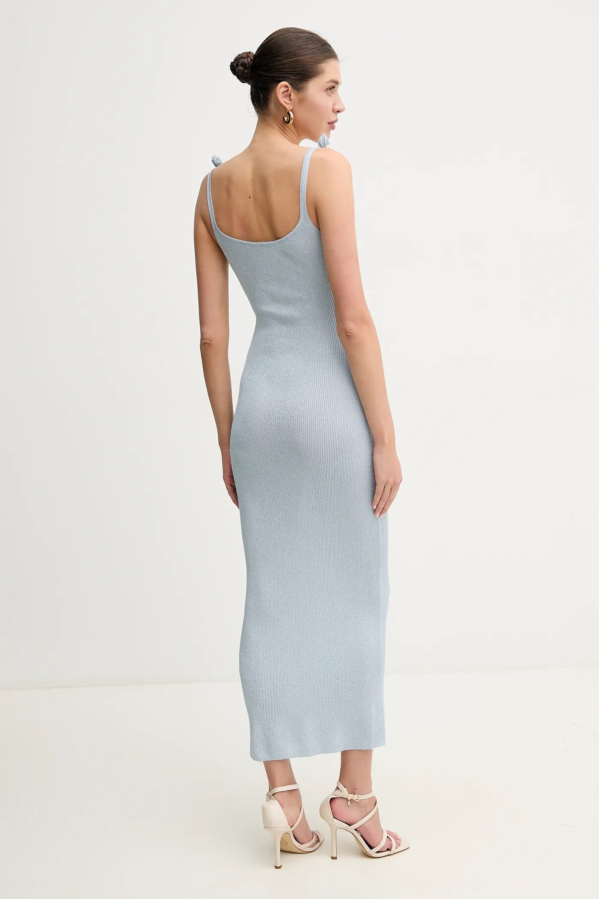 - Модель с декоративными навесными элементами. - Приталенный крой, подчеркивающий силуэт. - Классический круглый вырез. - Нерегулируемый, несъемный ремешок. - Модель без подкладки. - Материал с металлической нитью. - Длина: 143 см. - Ширина под мышками: 31 см. - Ширина талии: 25 см. - Ширина бедер: 34 см. - Размеры указаны для размера: S.