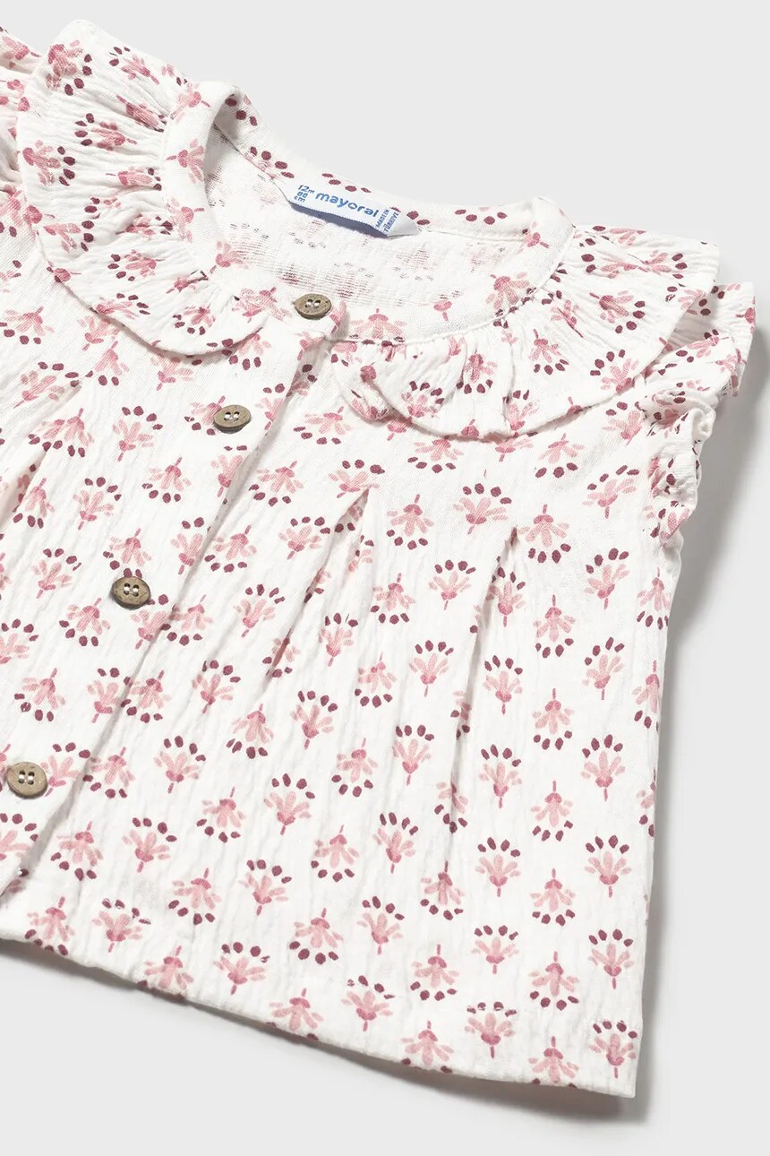Детская блузка из коллекции Mayoral. Модель выполнена из узорчатой ​​ткани. Имеет круглый вырез.