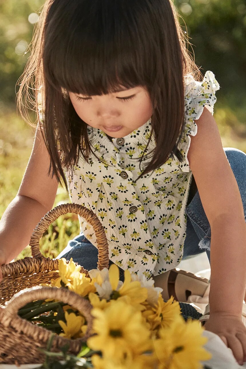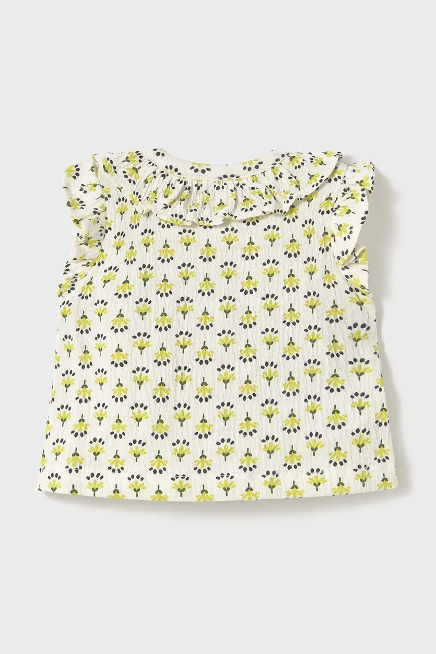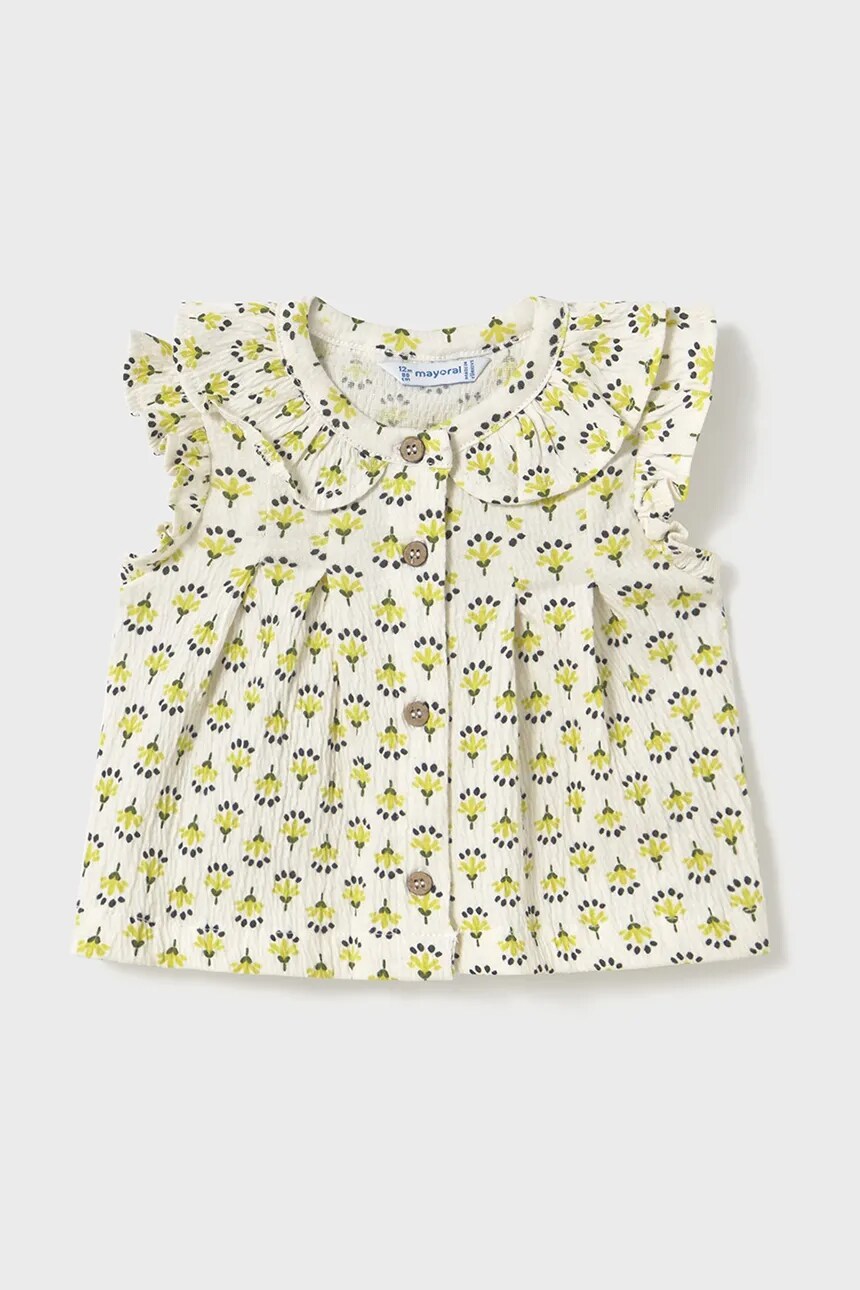 Детская блузка из коллекции Mayoral. Модель выполнена из узорчатой ​​ткани. Имеет круглый вырез.