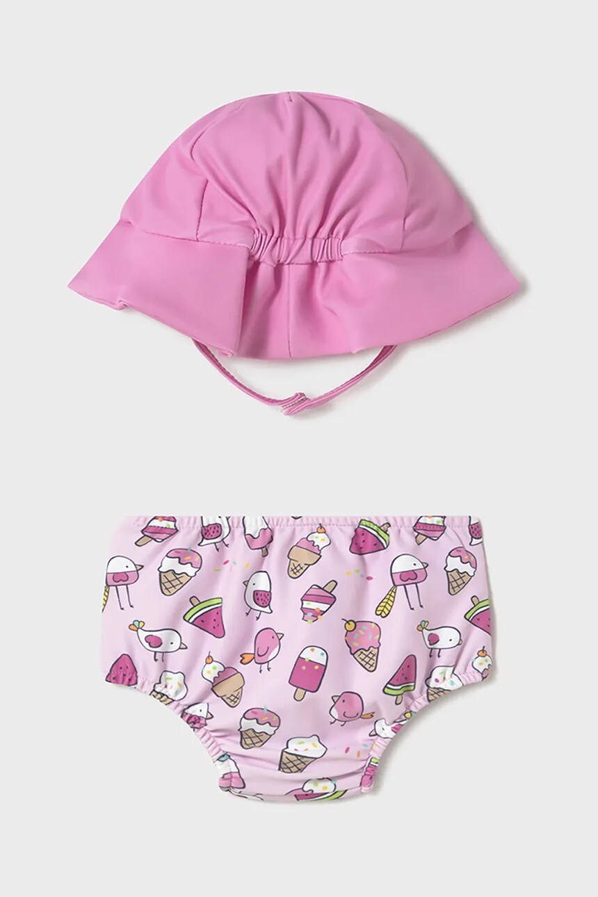 Детские купальники из коллекции Mayoral Newborn. Модель выполнена из узорчатой ​​ткани. В комплект модели входит шапка.