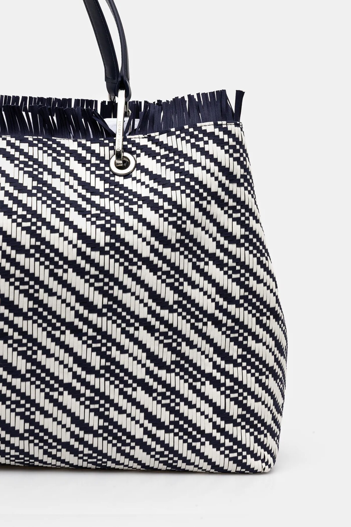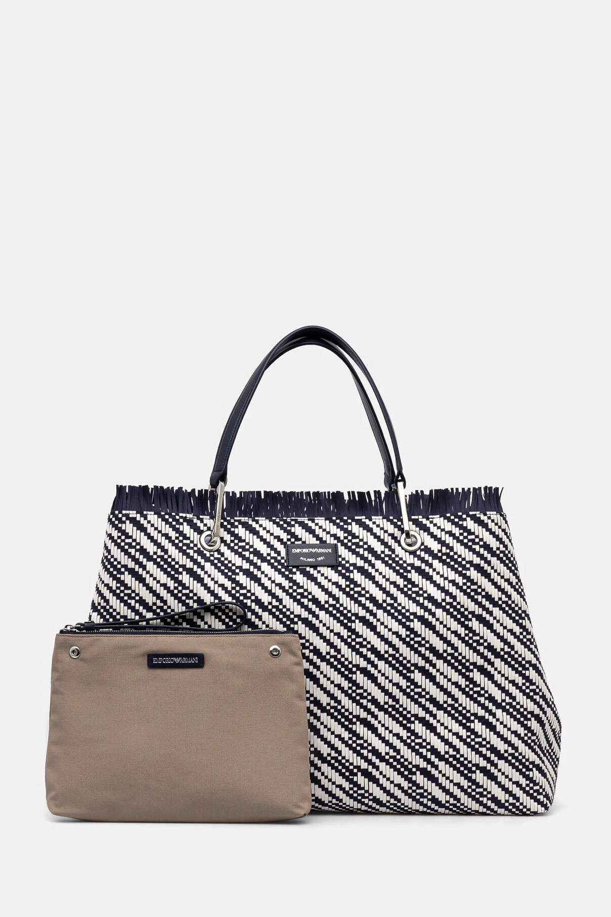 Большая сумка из коллекции Emporio Armani. Застегивающаяся модель, выполненная из комбинации текстильного материала и экокожи.