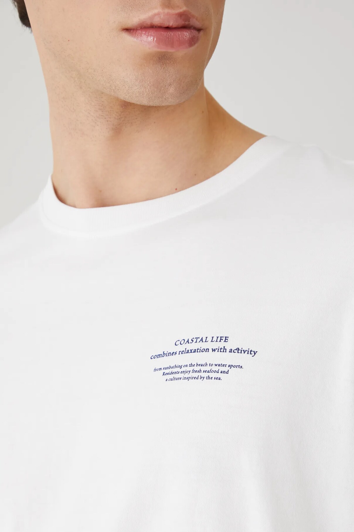 - Спереди принт с надписью: Прибрежная жизнь сочетает в себе отдых с активностью — от принятия солнечных ванн на пляже до занятий водными видами спорта. Жители наслаждаются свежими морепродуктами и культурой, вдохновленной морем.