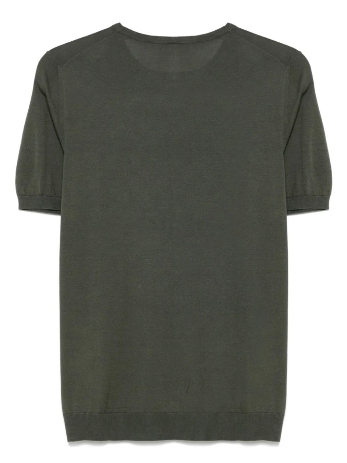 Темно-зеленые ребристые манжеты и подол, круглый вырез горловины, короткие рукава