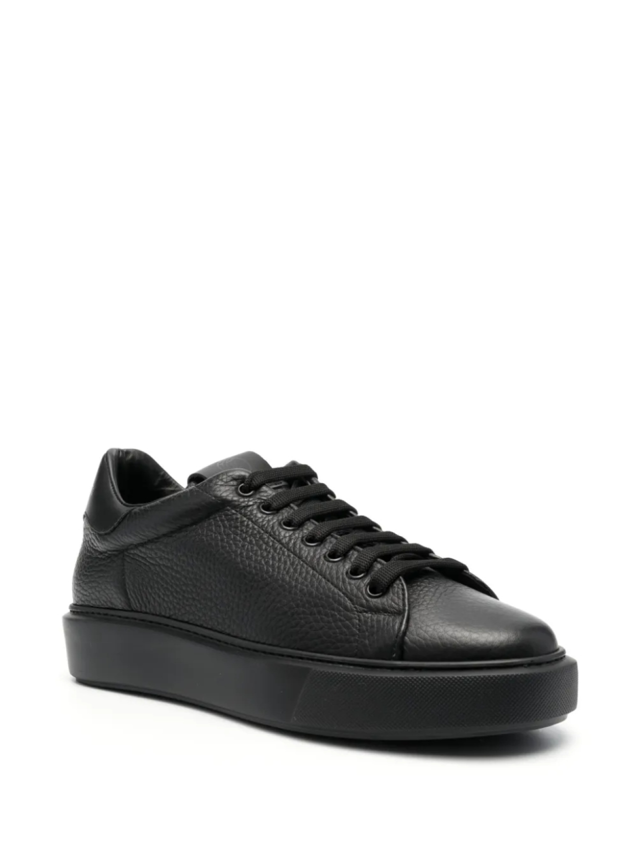 Черный, телячья кожа, зернистая текстура, нашивка с логотипом на язычке, стелька с логотипом, задник с логотипом, закругленный носок, шнуровка спереди и плоская кожаная подошва.