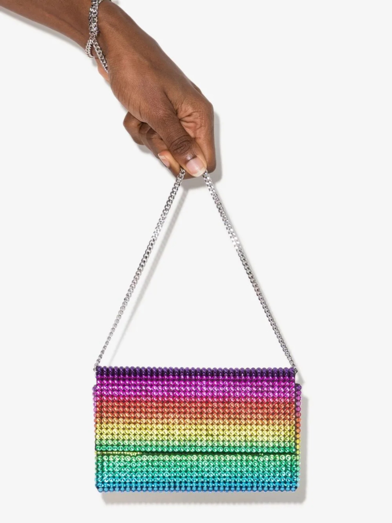 Разноцветный, сатиновый финиш, декор из кристаллов, съемный цепочный ремень на плечо, золотистая фурнитура, застежка с клапаном спереди, потайная застежка на магните и внутренний прорезной карман.