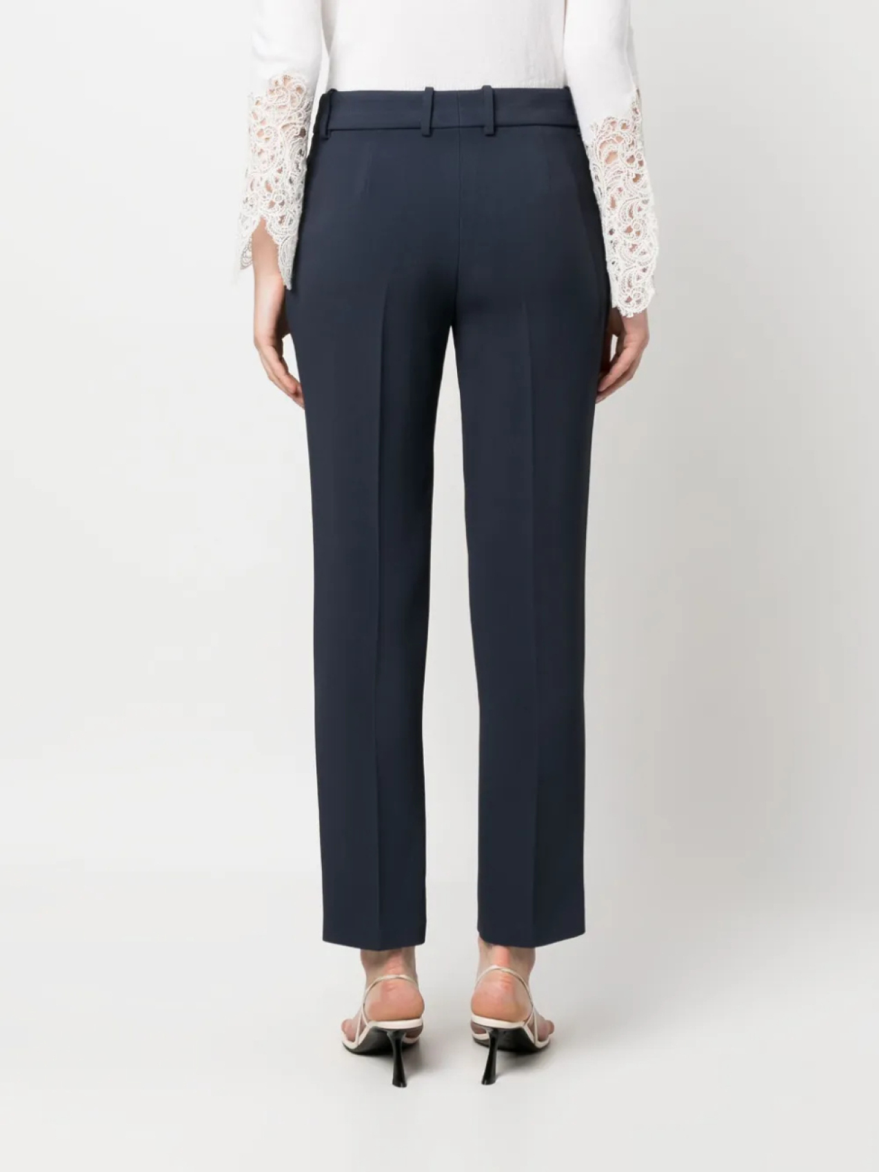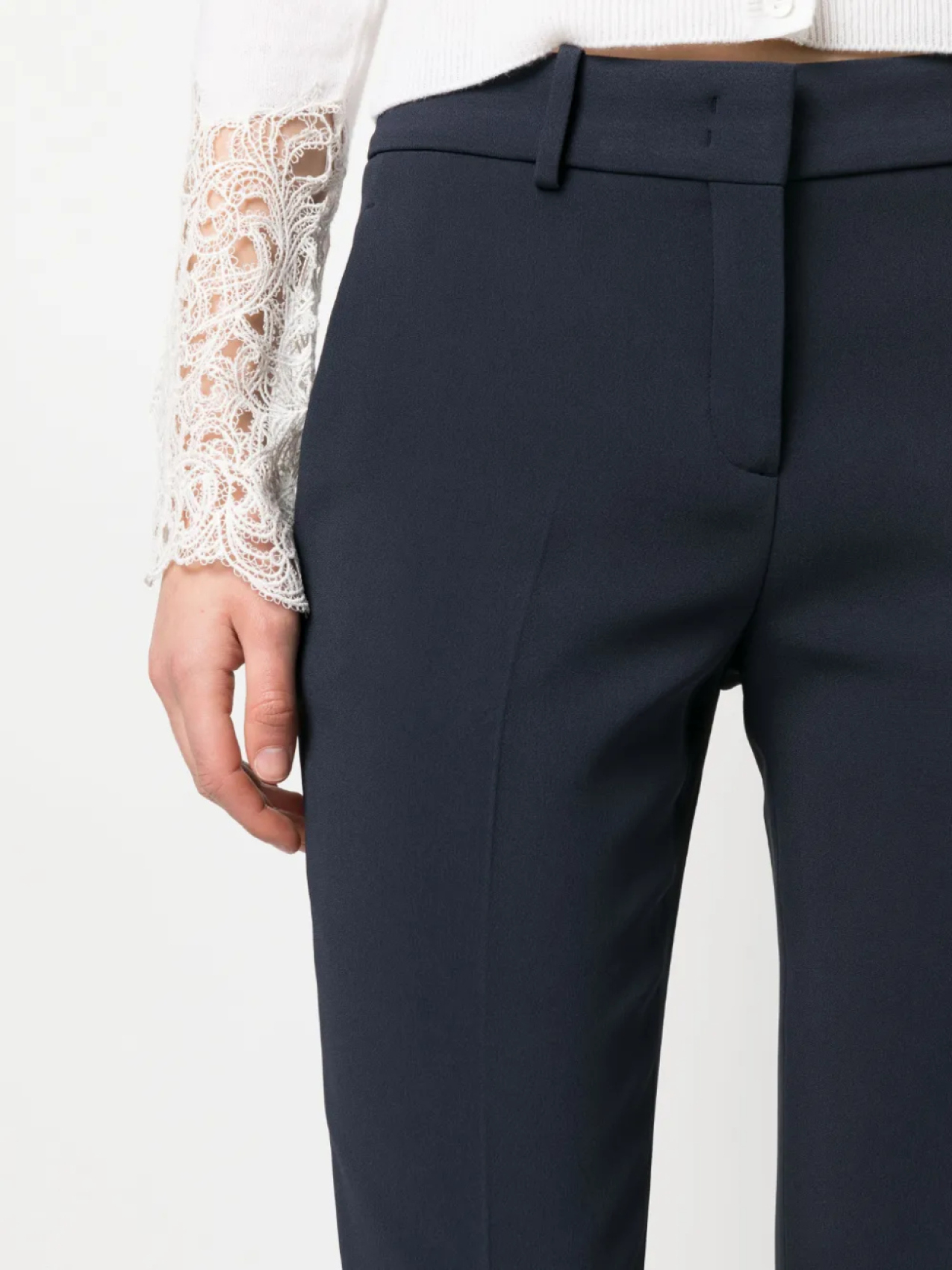 Темно-синий, стрелки, петли для ремня, строгий крой, средняя посадка, потайная застежка спереди, два вшитых кармана по бокам и укороченная длина.